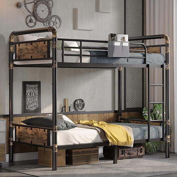 - Industrial Modern bunk bed:Vintage wood and PU leather decorate black bed frame. Minimalist style and Industrial design easy to accommodate with other bedroom furniture.