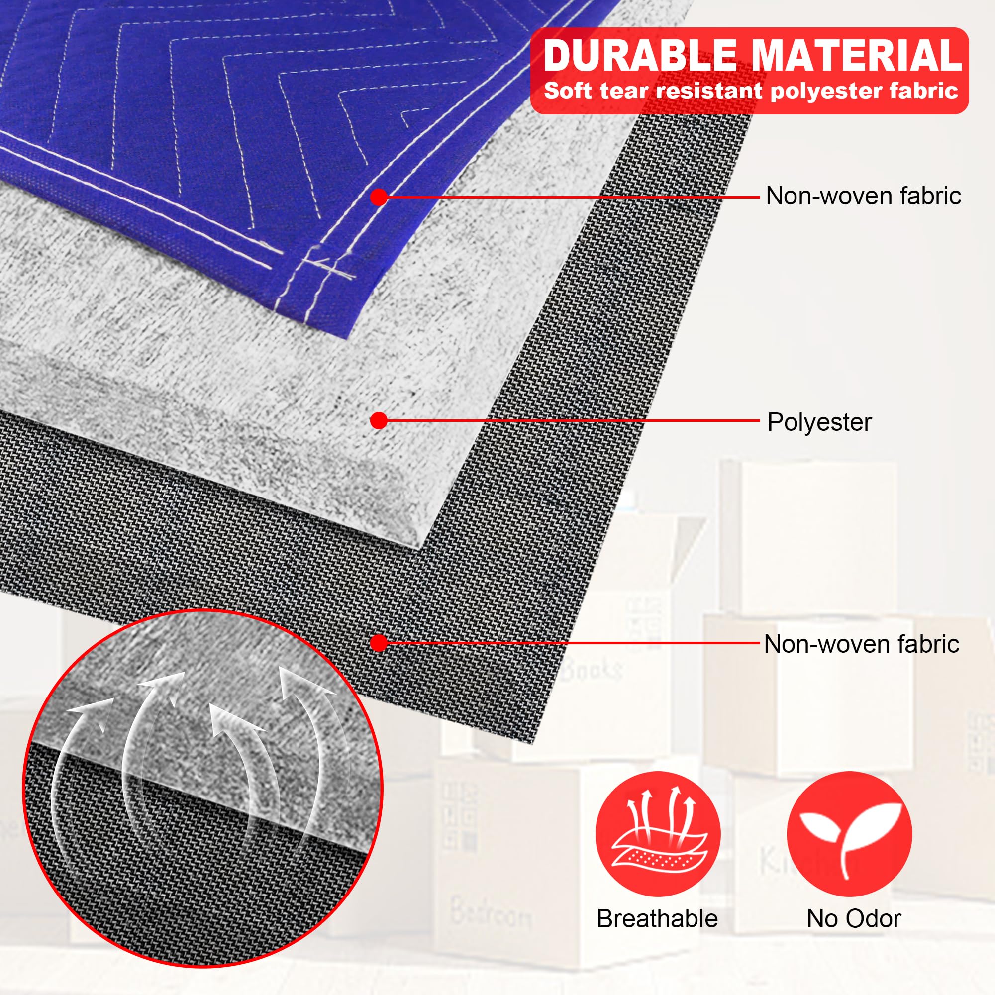 - 100% polyester fiber: The exterior of these furniture blankets is covered with non-woven fabric and cotton wool, which protects and stores furniture, fragile items, floors, and doorways from scratches, collisions, dirt, moisture, and other types of damage when moving.