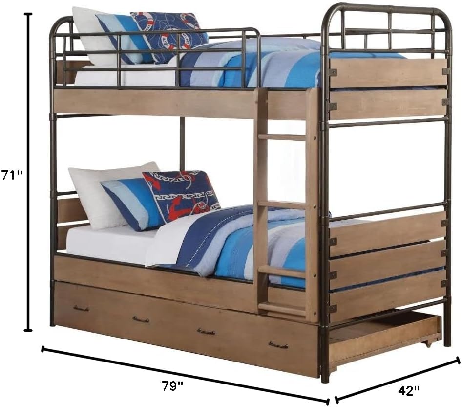 Twin Over Twin Bunk Bed with Trundle in Antique Oak