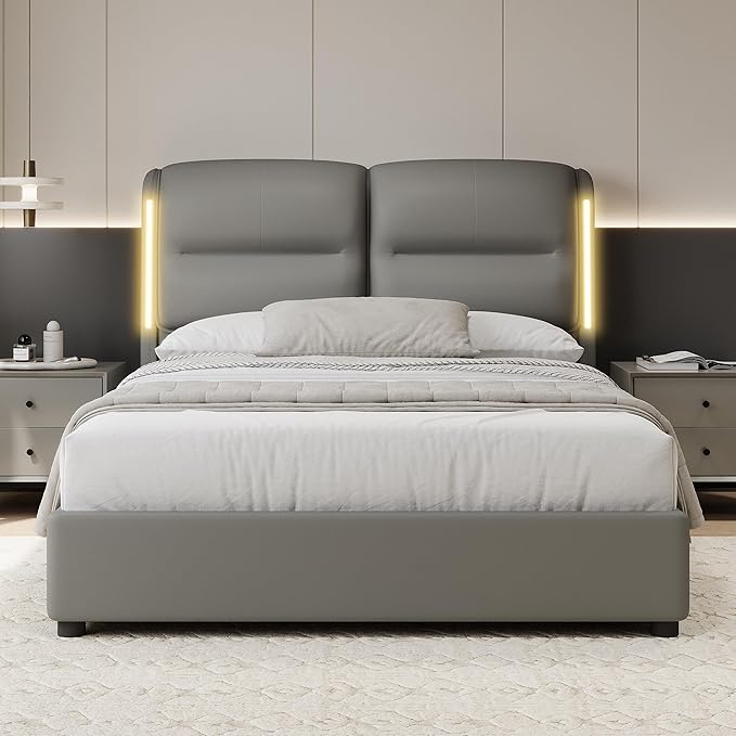 Upholstered Queen Size Hydraulic Platform Bed with Lift Up Storage and Sensor LED Lights