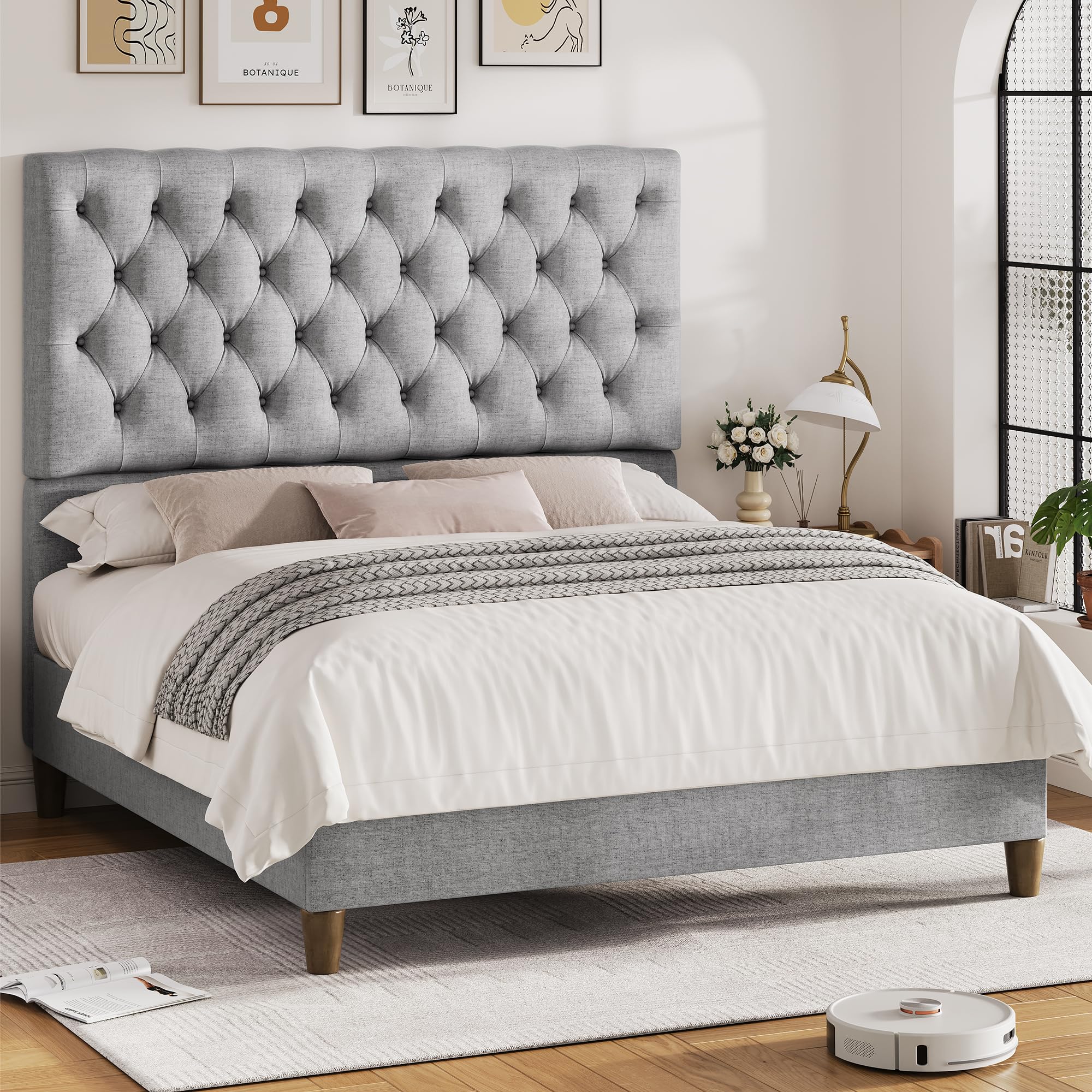 - [Cloud-Like Comfort] This upholstered queen bed frame have a 52.75" extra-tall headboard features 4-inch plush linen-padded cushioning & ergonomic support. Perfectly cradles your back for reading, relaxing, or scrolling – luxuriously comfortable, every time.