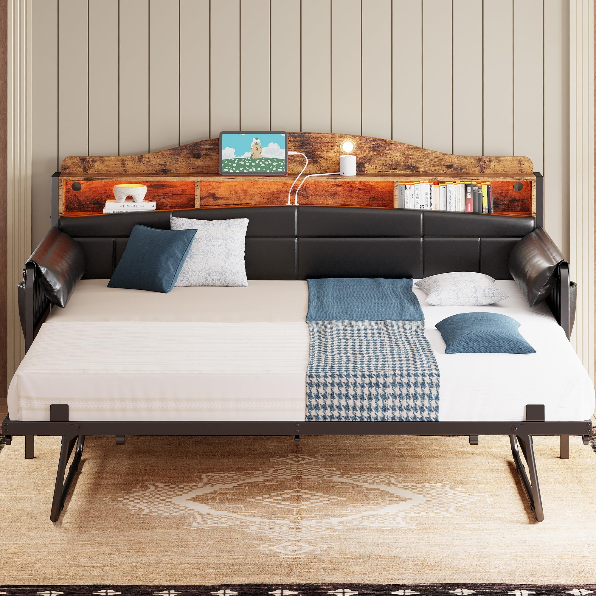 Daybed with Trundle, Twin Day Bed with Bookcase Headboard, Bedside Caddy