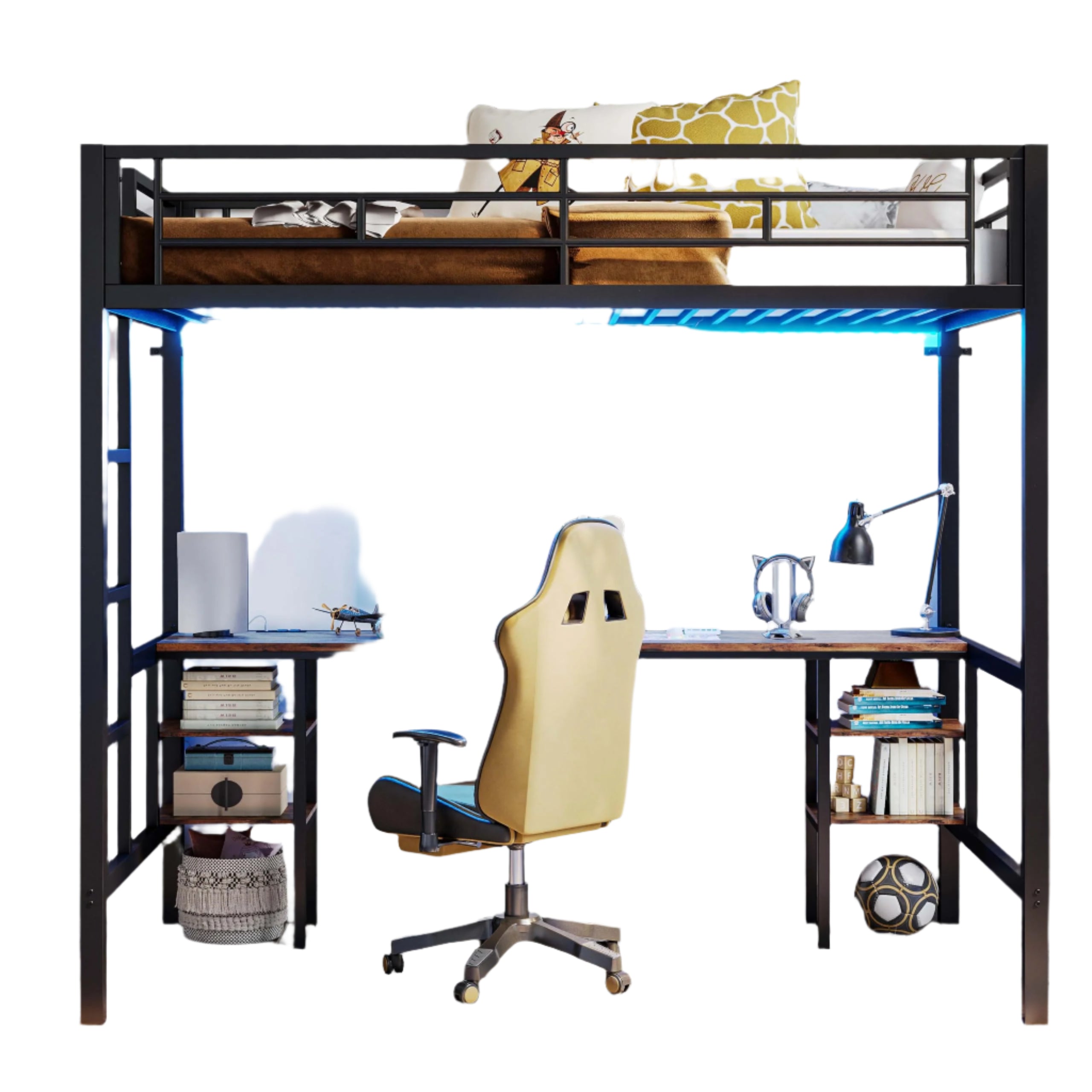 - Storage Design: The loft bed frame has space under the bed, and 4 open storage shelves can hold your books, documents, home printers, and other items.