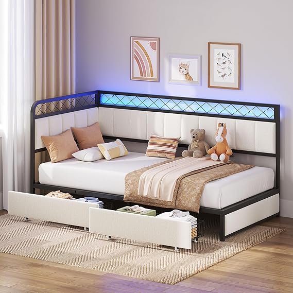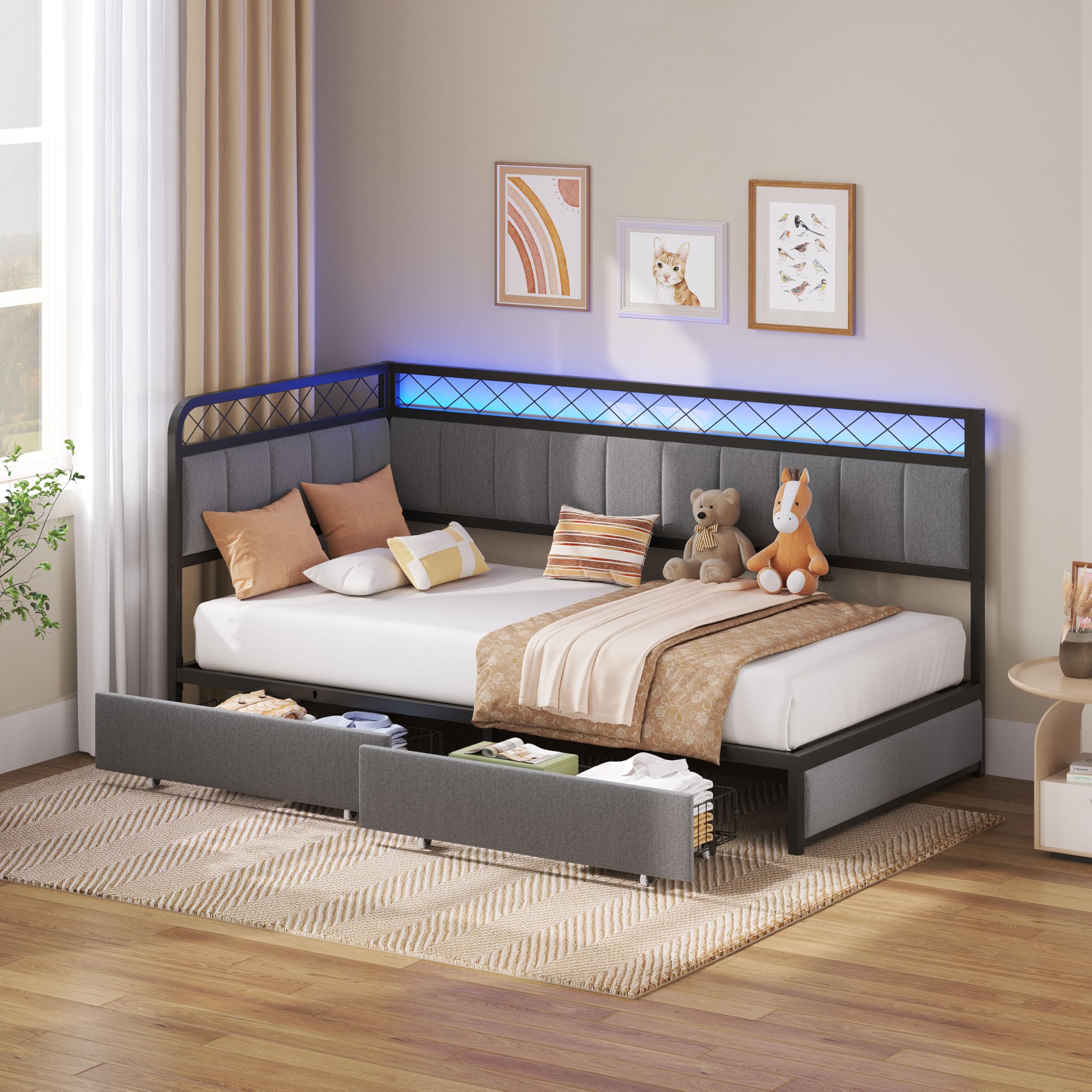 Twin Corner Bed Frame with 2 Storage Drawers, Daybed with LED Lights