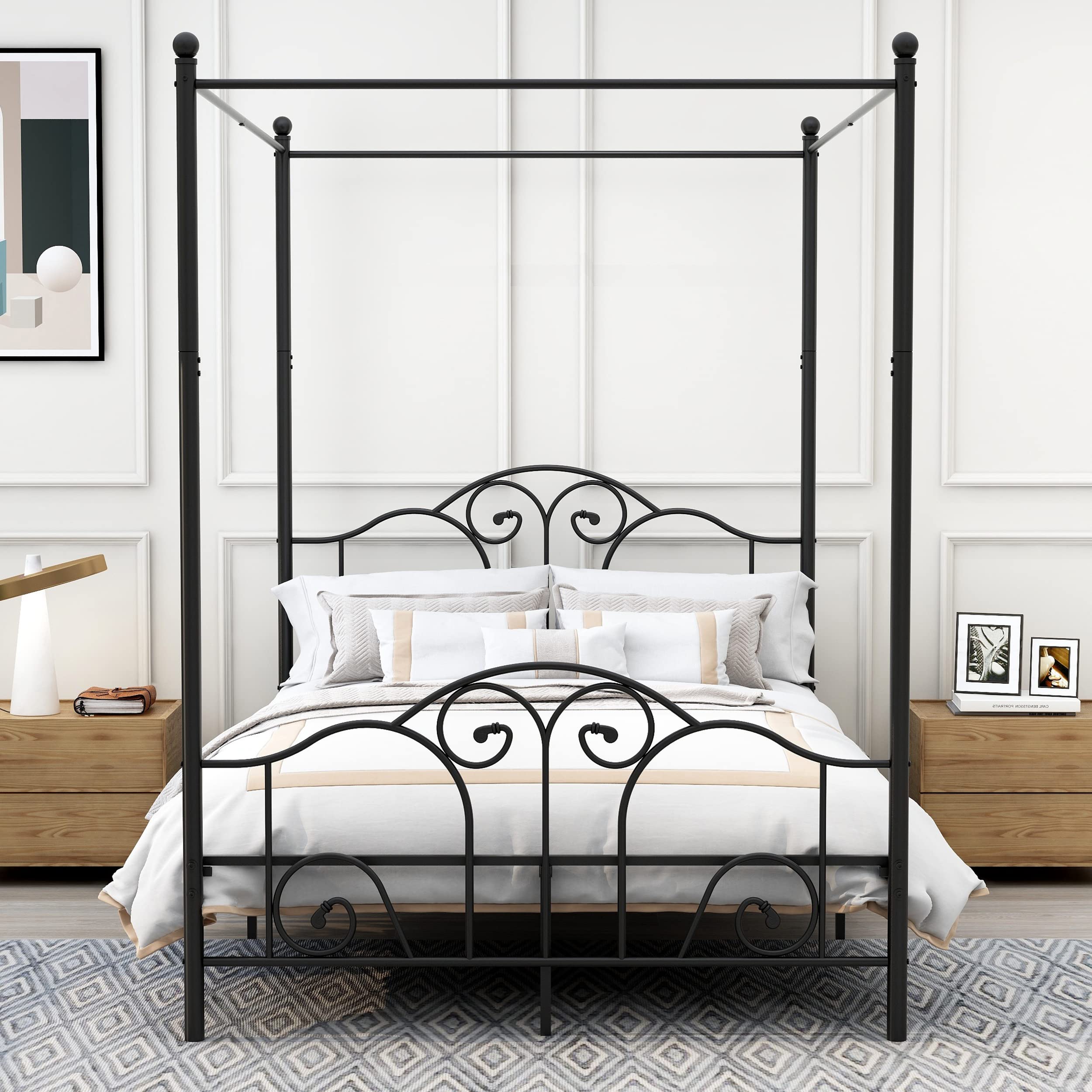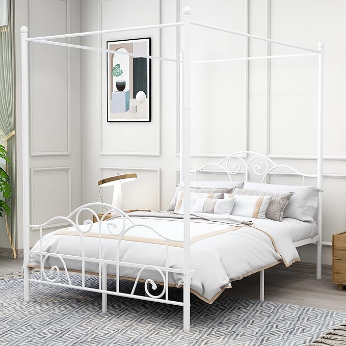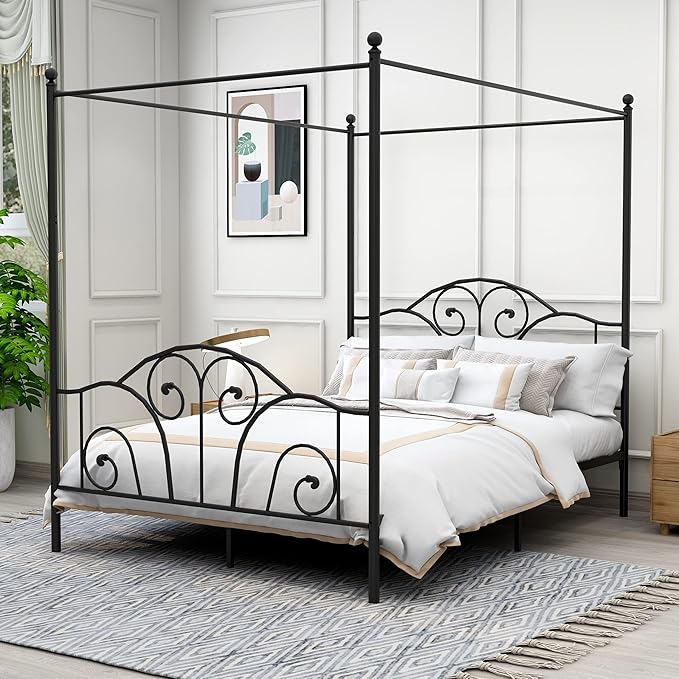 Full Size Four-Poster Metal Canopy Bed Frame with Headboard and Footboard Sturdy