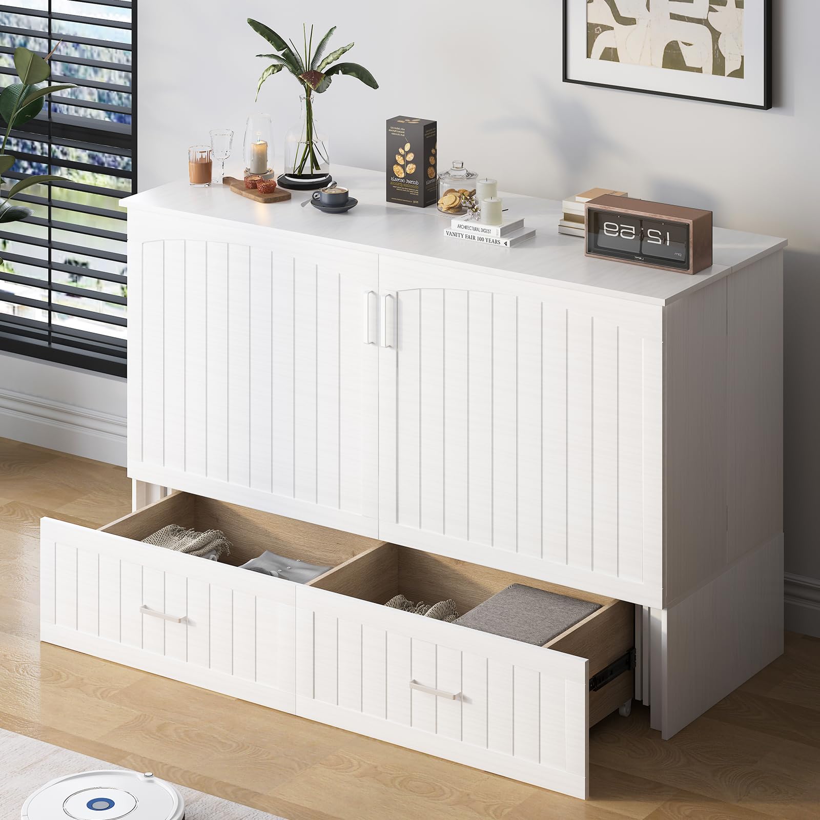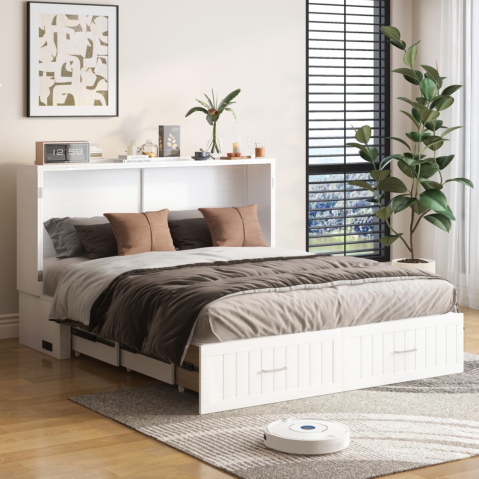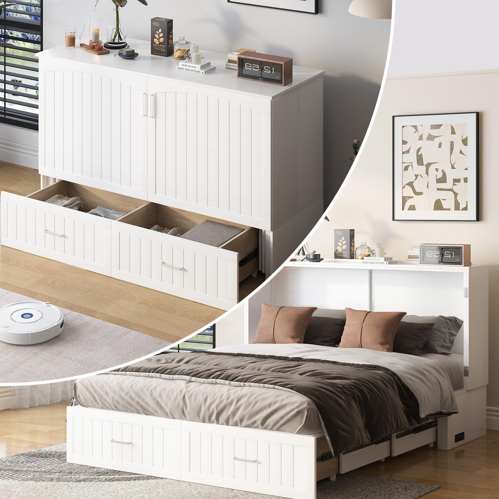 Queen Murphy Bed Cabinet, Cube Chest Bed with Built-in Charging Station