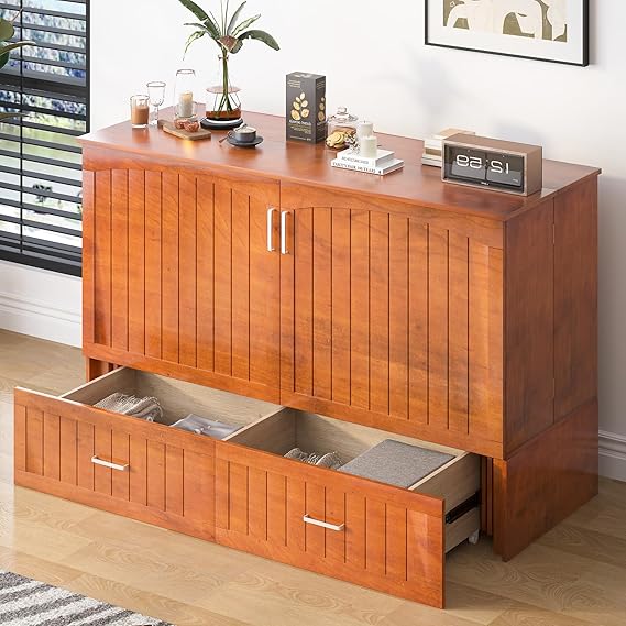 - This queen size murphy bed is made of solid poplar wood and high quality MDF, and edged with birch veneer. When the Murphy bed is folded up, there are two spacious storage drawers at the bottom, which can be placed in the loft or guest room, and usually used to store some unused items or clothes to better utilize every part of the space.
