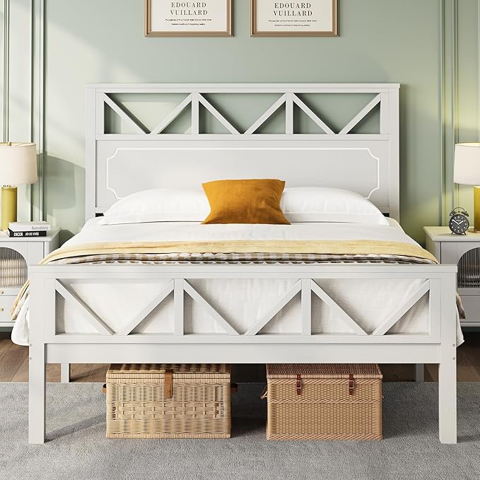 - Solid Wood Bed: The white wooden bed frame is stylish, elegant, and can easily blend with any bedroom decor. The entire bed frame is made of rubber solid wood, which is more durable. Our queen size wooden bed frame can bear 1000 pounds, providing you with comfortable and uninterrupted sleep