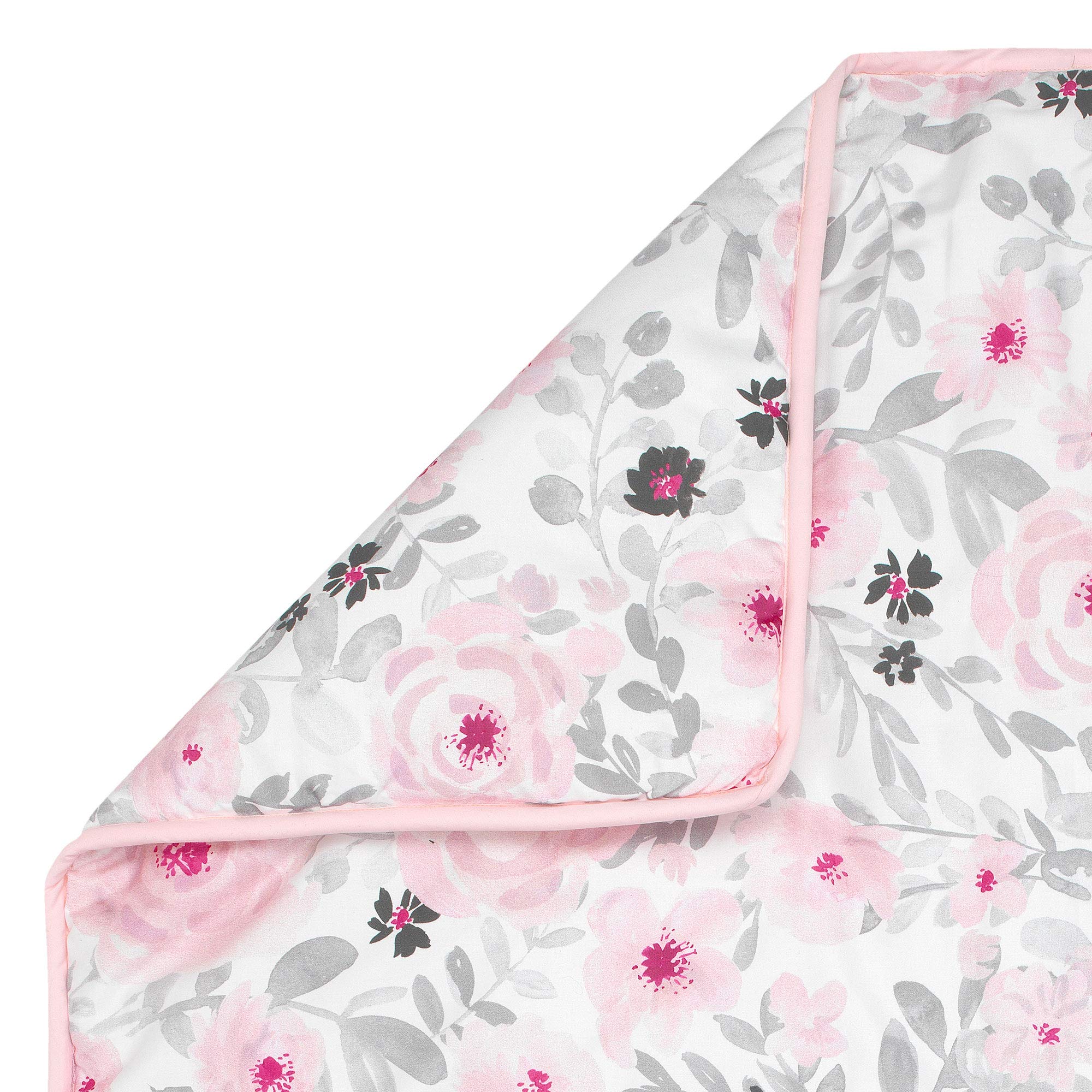 - The fitted crib sheet and quilt are decorated in shades of pinks and grays. They have been digitally printed in a high-resolution microfiber which enhances their colors
