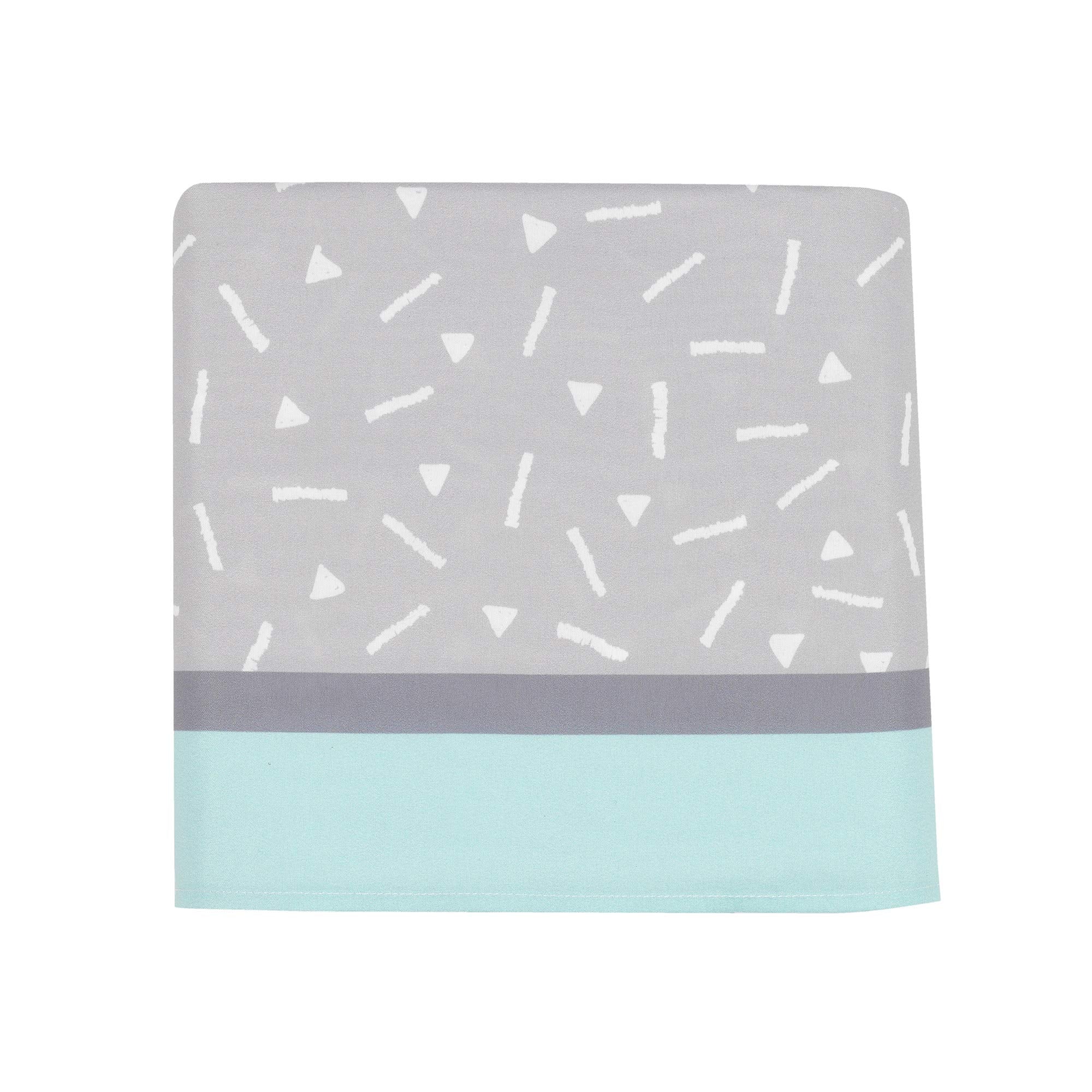 - Coordinating crib skirt is a gray and White geo print bordered in a dusty Aqua