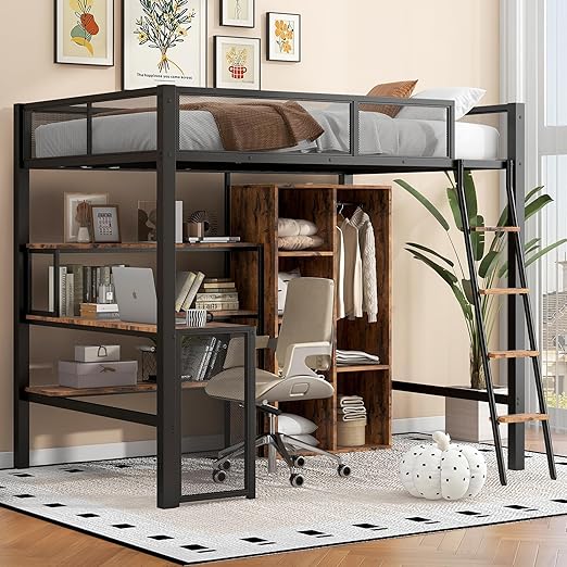 Full Size Loft Bed with Desk,Metal Heavy Duty Loft Bed Frame with Storage