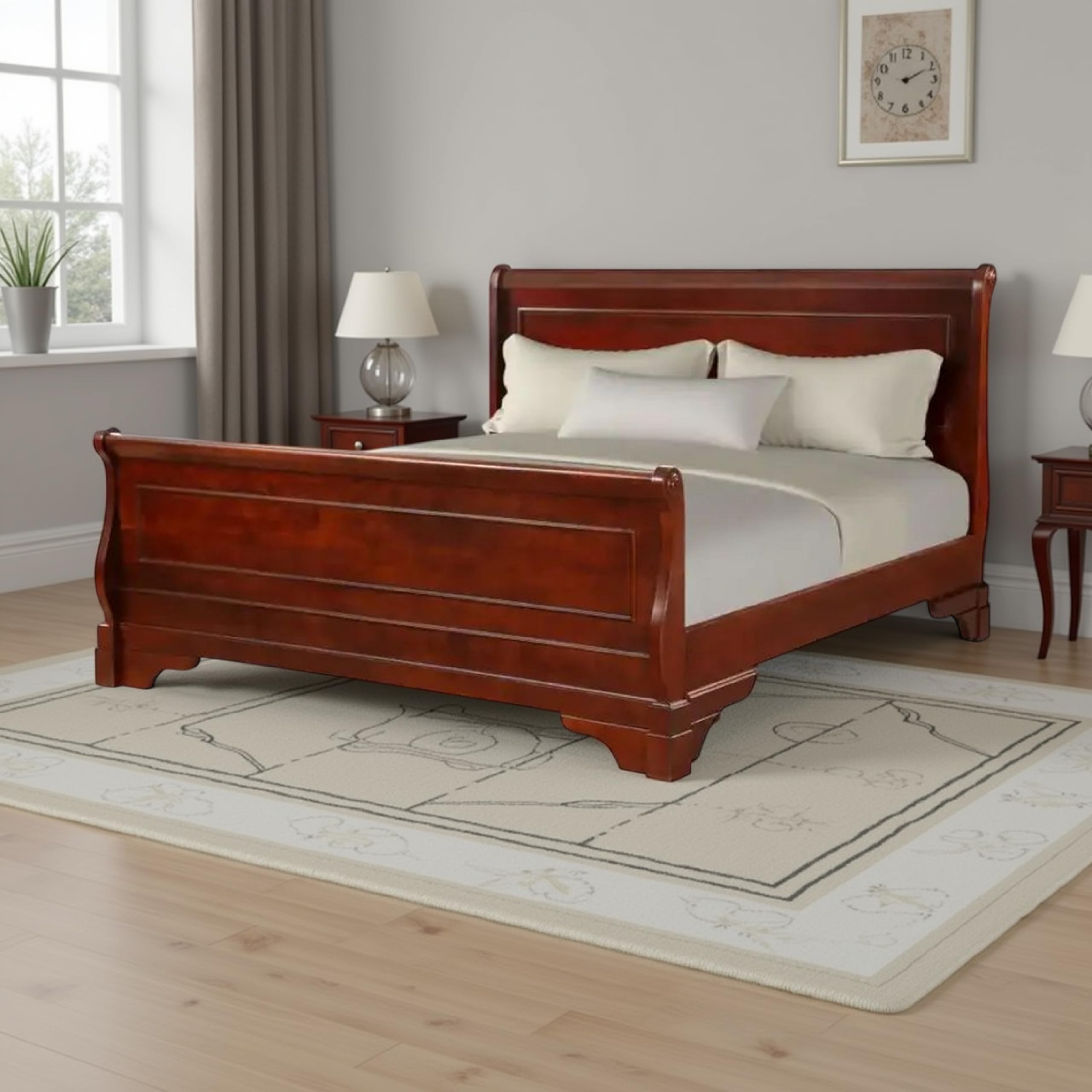 - Classic sleigh panel headboard with inset carvings with rich bordeaux brown finish adds warmth