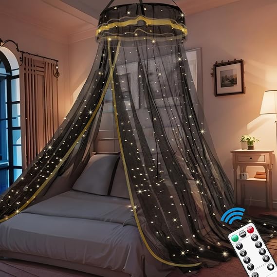- Luxury Noir-Gold Aesthetic: Crafted with jet-black premium polyester mesh accented by gold lines, this mosquito net combines modern sophistication with vintage charm. The golden line detailing complements both contemporary and bohemian bedroom styles