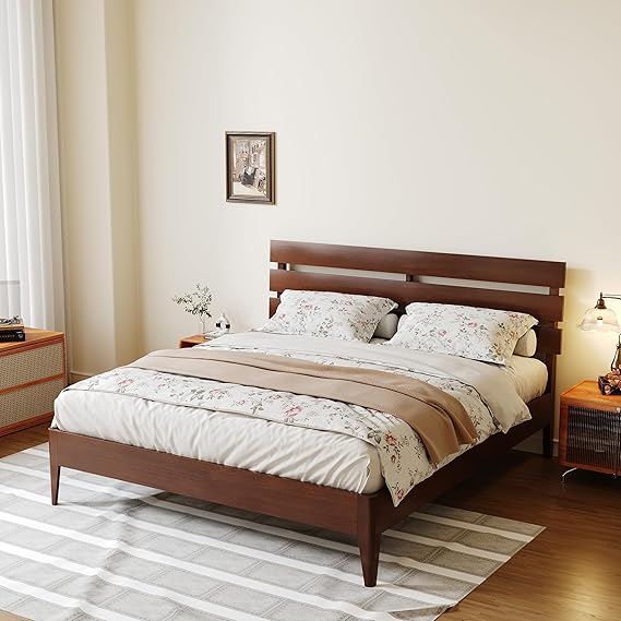 Wood Queen Bed Frame with Headboard, Mid-Century Modern Solid Wood Platform Bed