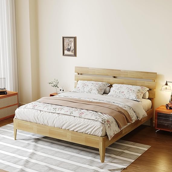 Wood Queen Bed Frame with Headboard, Mid-Century Modern Solid Wood Platform Bed