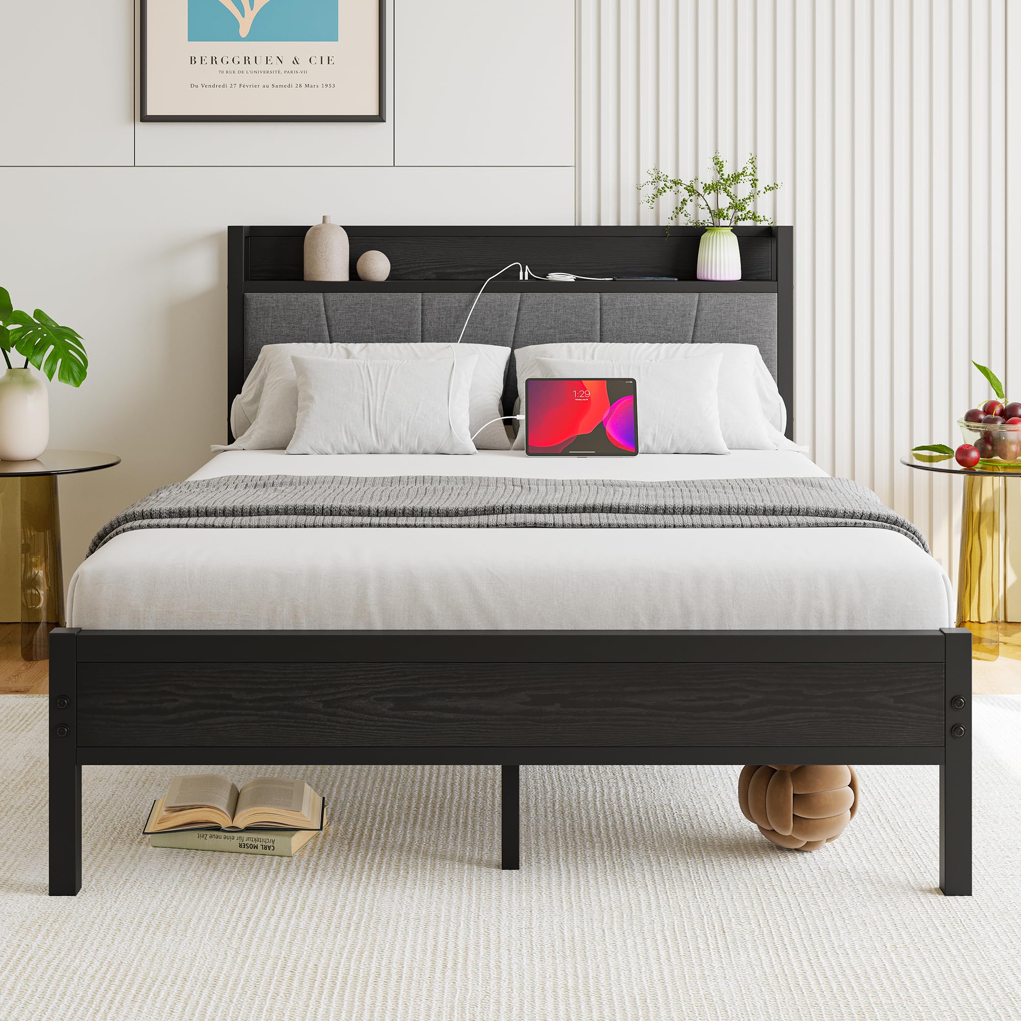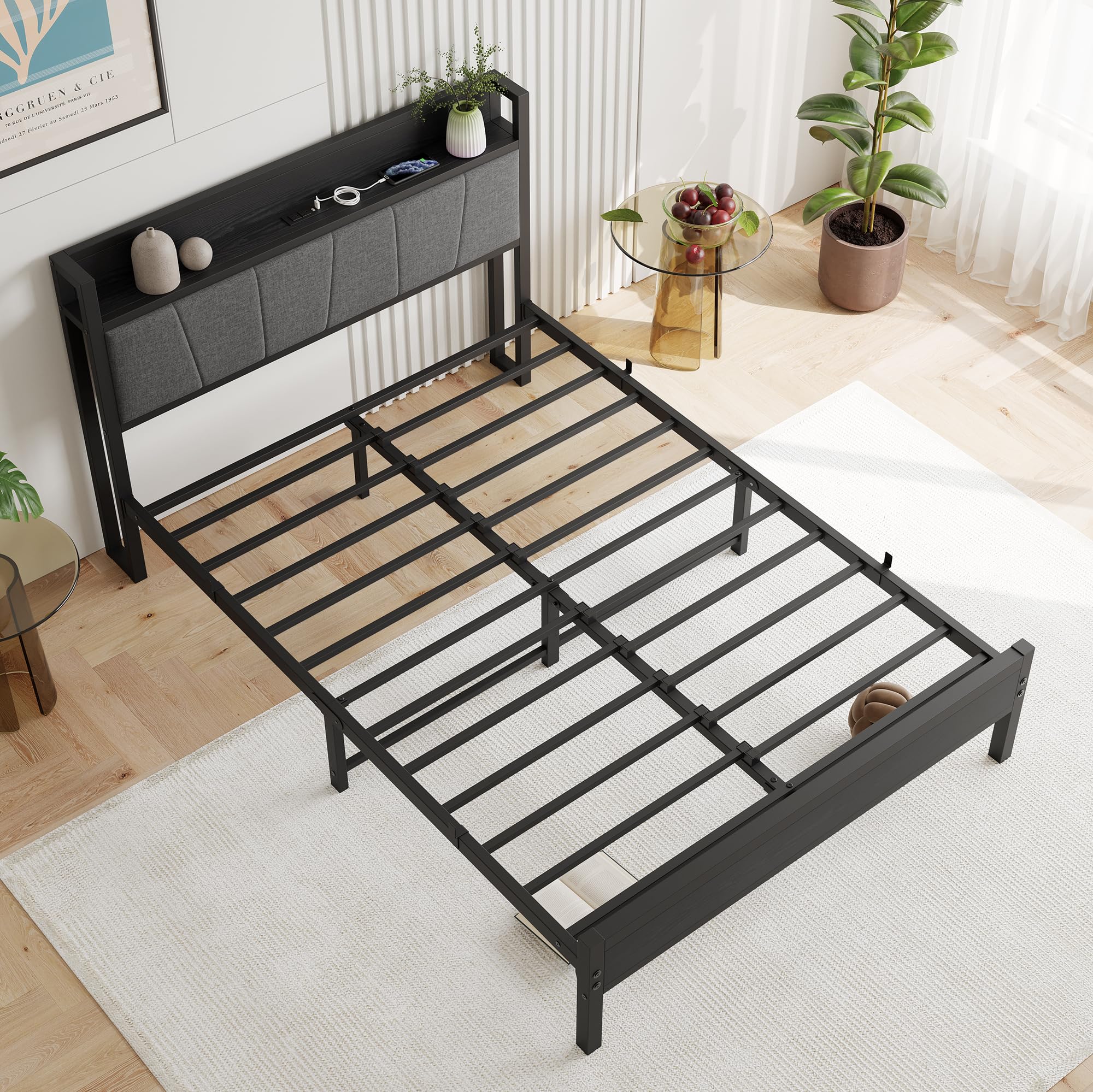 Black Full Size Bed Frame with Storage Headboard,Metal Upholstered Platform