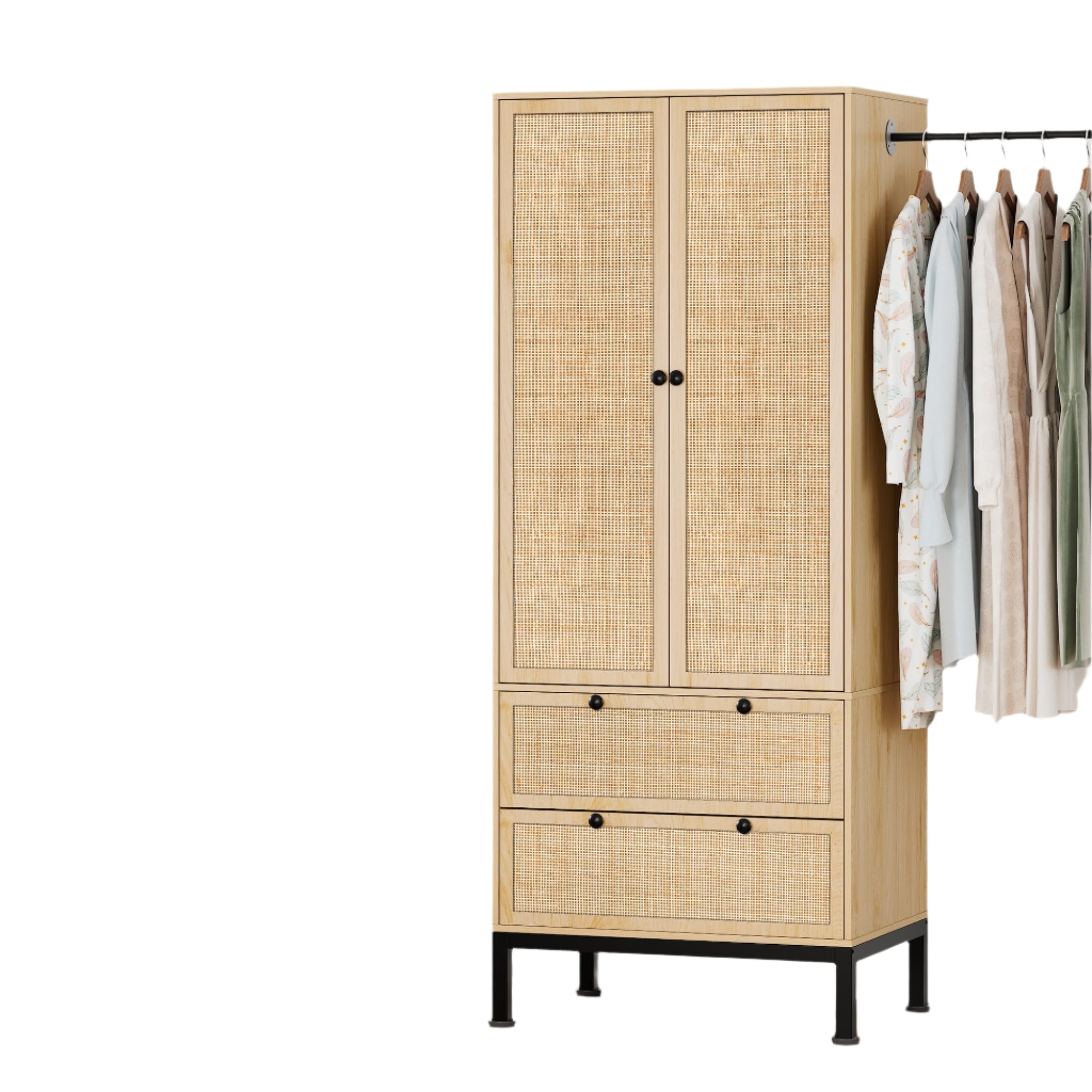 - Premium Material & Sturdy Construction: Our wardrobe armoire closet is constructed of high-grade MDF and features natural rattan doors with metal hinges. The upgraded sturdy steel bottom with steel legs ensures a strong load-bearing capacity and prevents deformation, ensuring long-lasting durability for years to come.