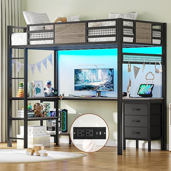 - Loft Bed Frame with Desk and Charging Station: Game changer twin size loft bed frame features L-shaped desks. In Addition, the desks of this bed equipped with charging station offering convenient charging for your electrical devices