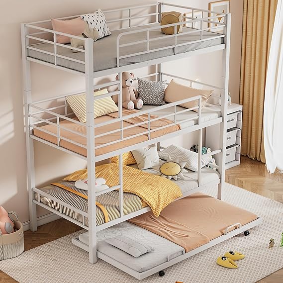 - This Twin size triple metal bunk bed with trundle offer 3 twin size beds and a twin size trundle for sleep, the down be and trunlde is low height which is super safe for little kids,you can not worry he/she falling off. The twin triple bunk bed can bed divided into one twin size bunk bed and one daybed with trundle