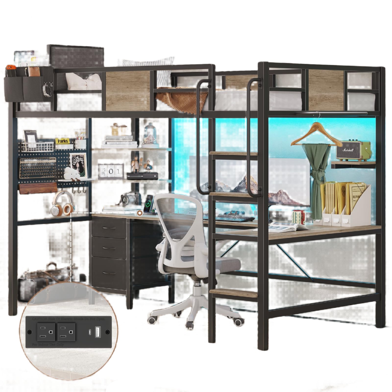 - Under the twin loft bed, 78-inch-long L-shaped desk can hold your computer, monitor, keyboard, files, books or a CPU stand for home office. Built-in charging station in front of the desk includes 2-Outlets & 1 USB Port and 1 Type-C to provide power for up to 4 devices simultaneously. Power outlet allows you to charge cell phones, tablets, notebooks, etc.Solve the problem of charging electronic devices for you easily.