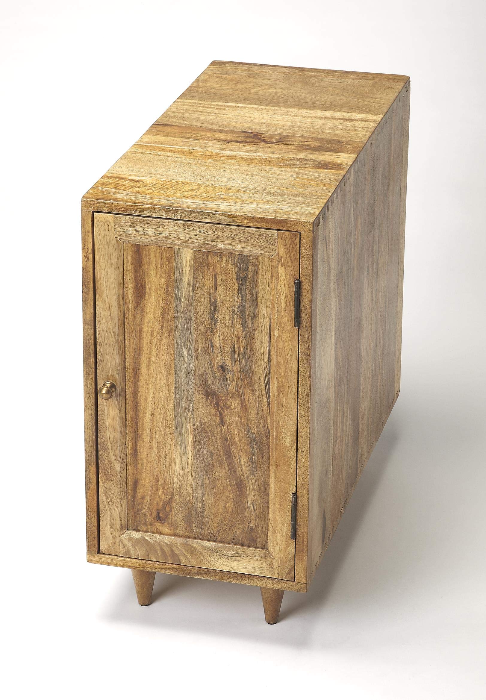 - The transparent wet sand finish enables the graining of the exotic Indian mango wood to shine through on this table with inside storage and a deep top for abundant chairside convenience. Plank construction, tapered legs and the simple brass-finished pull enhance its aesthetic.