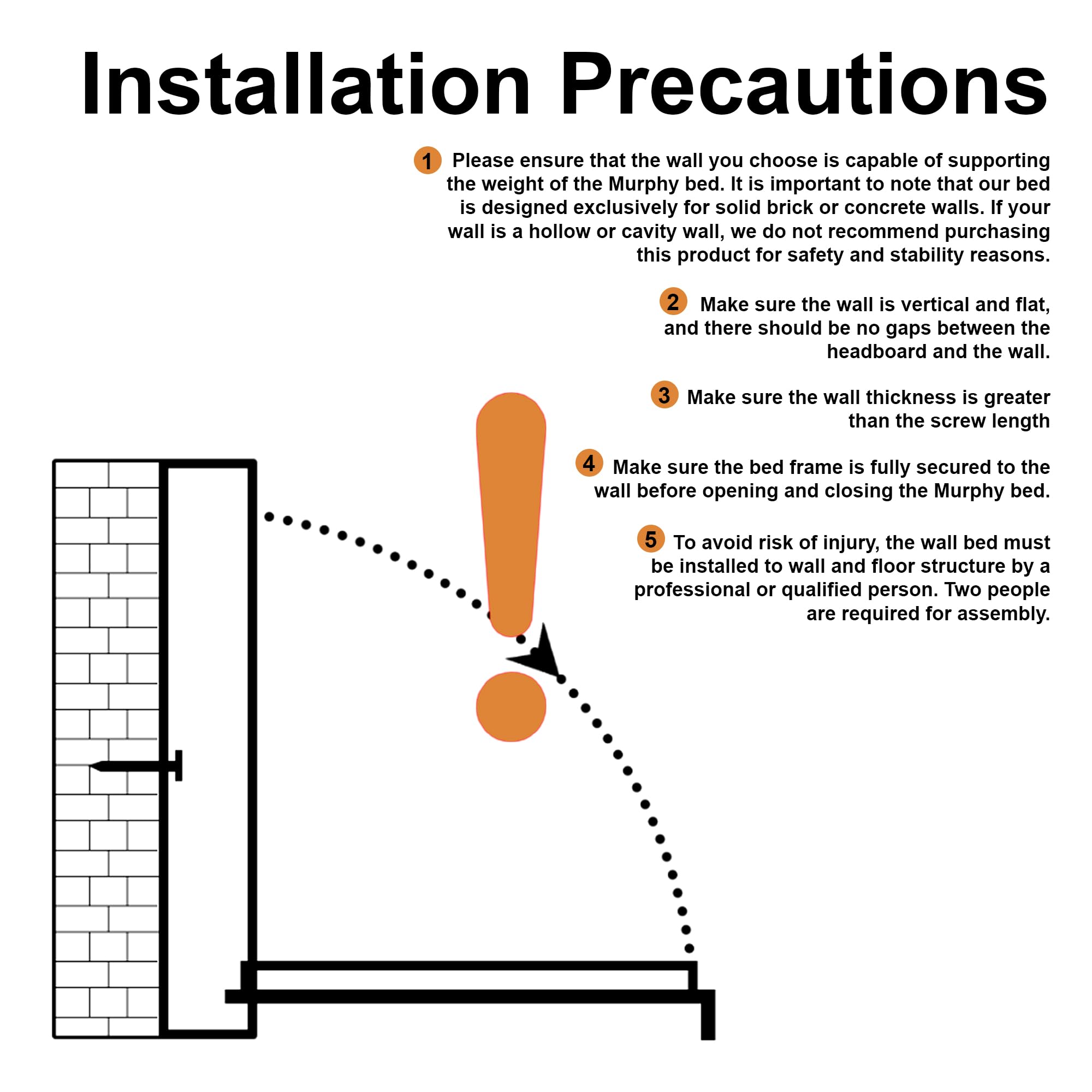 - ✔Installation and precautions: Two-person assembly is recommended, and the wall-mounted Murphy bed must be installed on the wall by a professional or qualified person. Please make sure that the wall you choose can support the weight of the Murphy bed. It should be noted that our Murphy beds are suitable for solid brick walls or concrete walls. (Our full-size Murphy beds come in two packaging boxes).