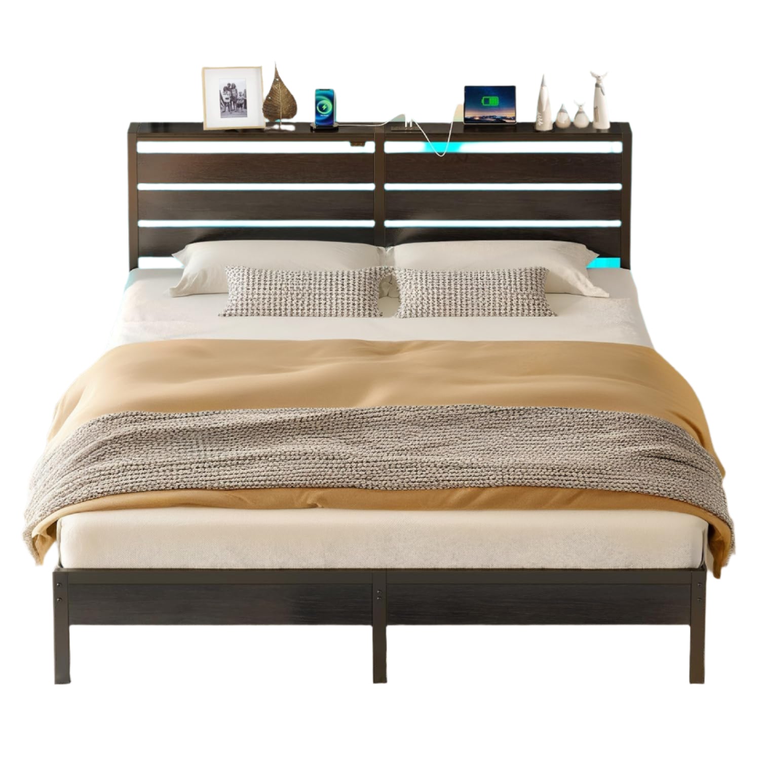 - Functional Headboard: With an expanded shelf, Perfect for holding your phone, glasses, and other necessities.For convenient charging, the headboard is equipped with pre-installed 2USB & 2 AC. This thoughtful design solves the low battery issue for your electronics while you're comfortably lying in bed.