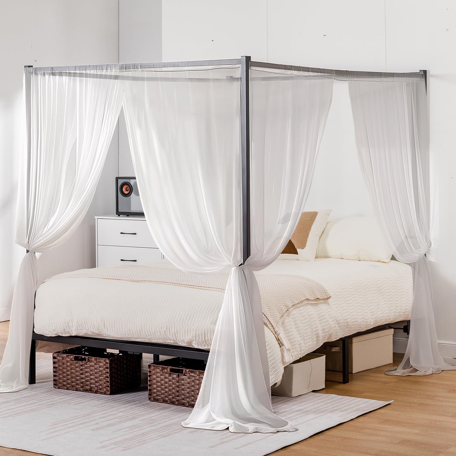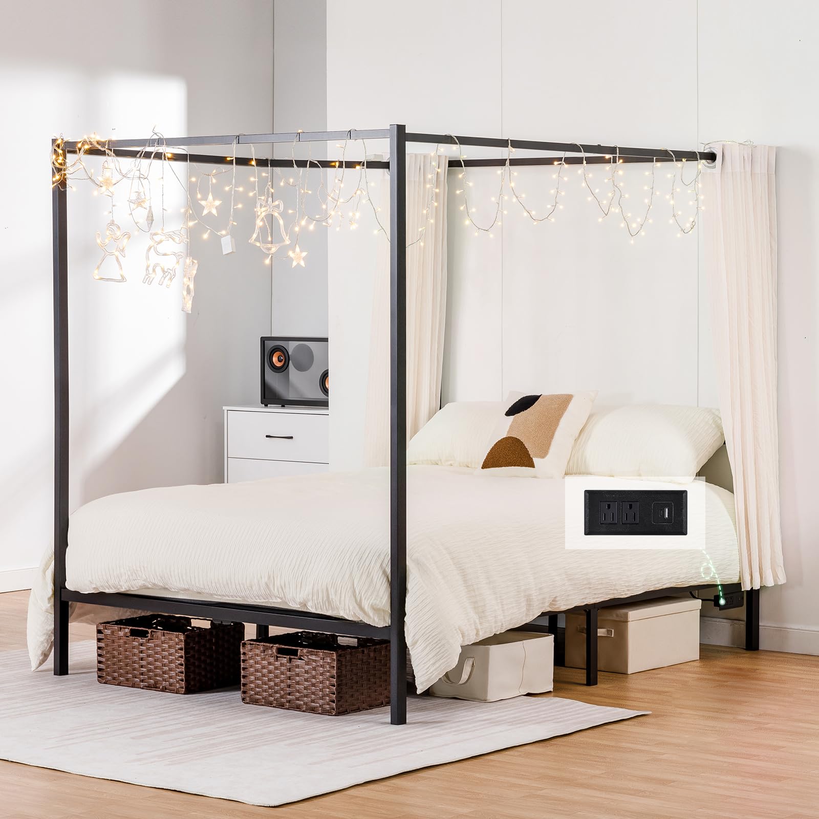 Canopy Bed Frame, Metal Bed with Movable Charging Station, Elegant Four-Poster Design