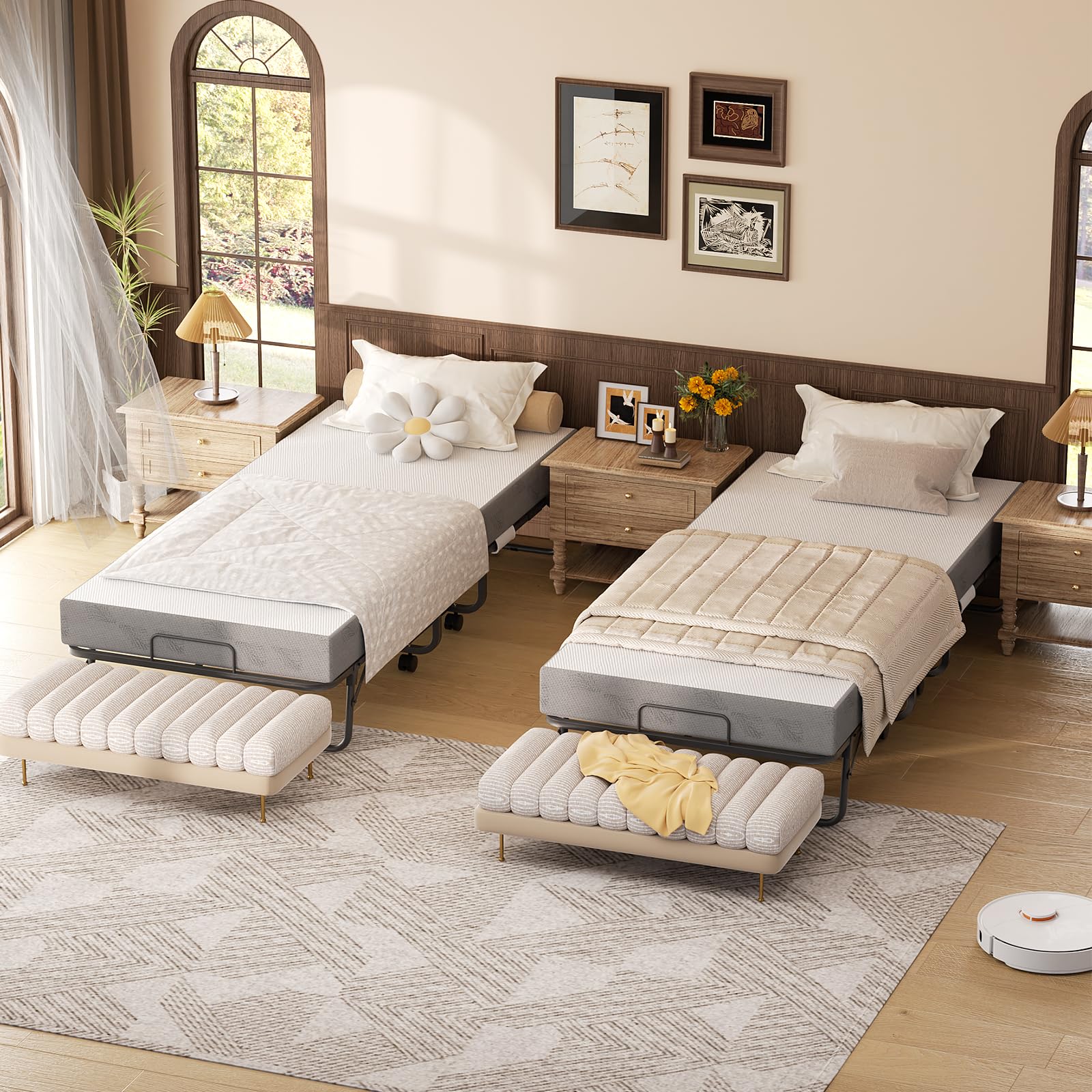 - Portable and Space-saving: This sturdy folded bed frame is easy to install and convenient to use, just unfold it and lock the legs. The foldaway bed can also be conveniently rolled away with its smooth wheels, and can be easily stored in the walk-in closet when not in use to save more space. Folded size: 31"W x 15"D x 44.5"H, Opened size: 31"W x 75.6"D x 17.7"H