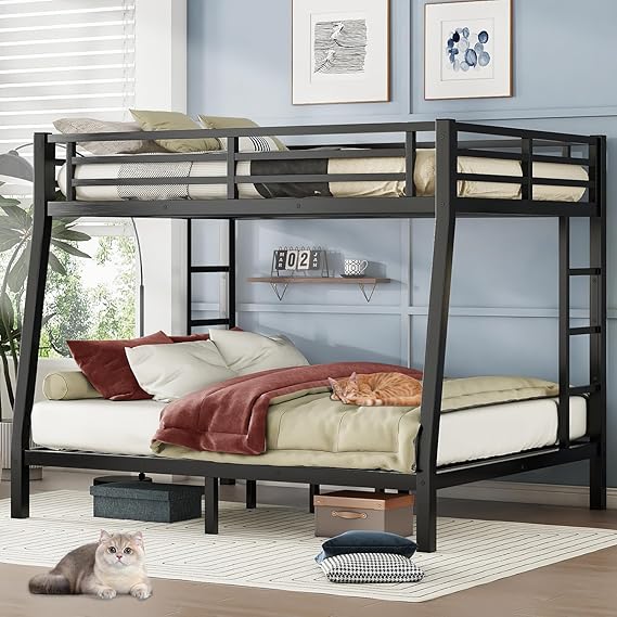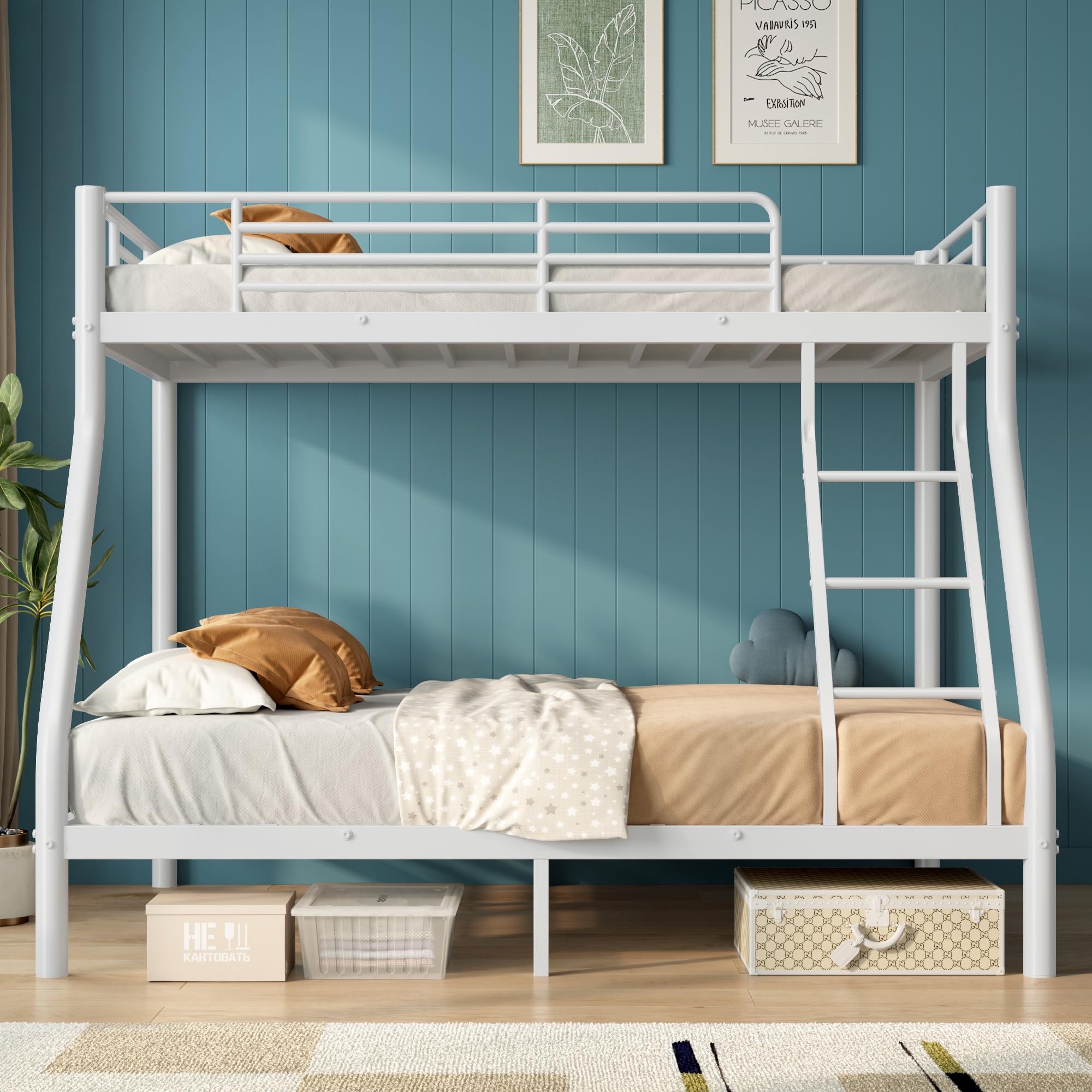 - The bunk beds twin over full is made of modern design and sturdy metal frame structure, and the surface is rust-proof powder coated. It is stable and you can turn over freely when sleeping without making loud noises. No box spring required, metal slats support the mattress without sliding.