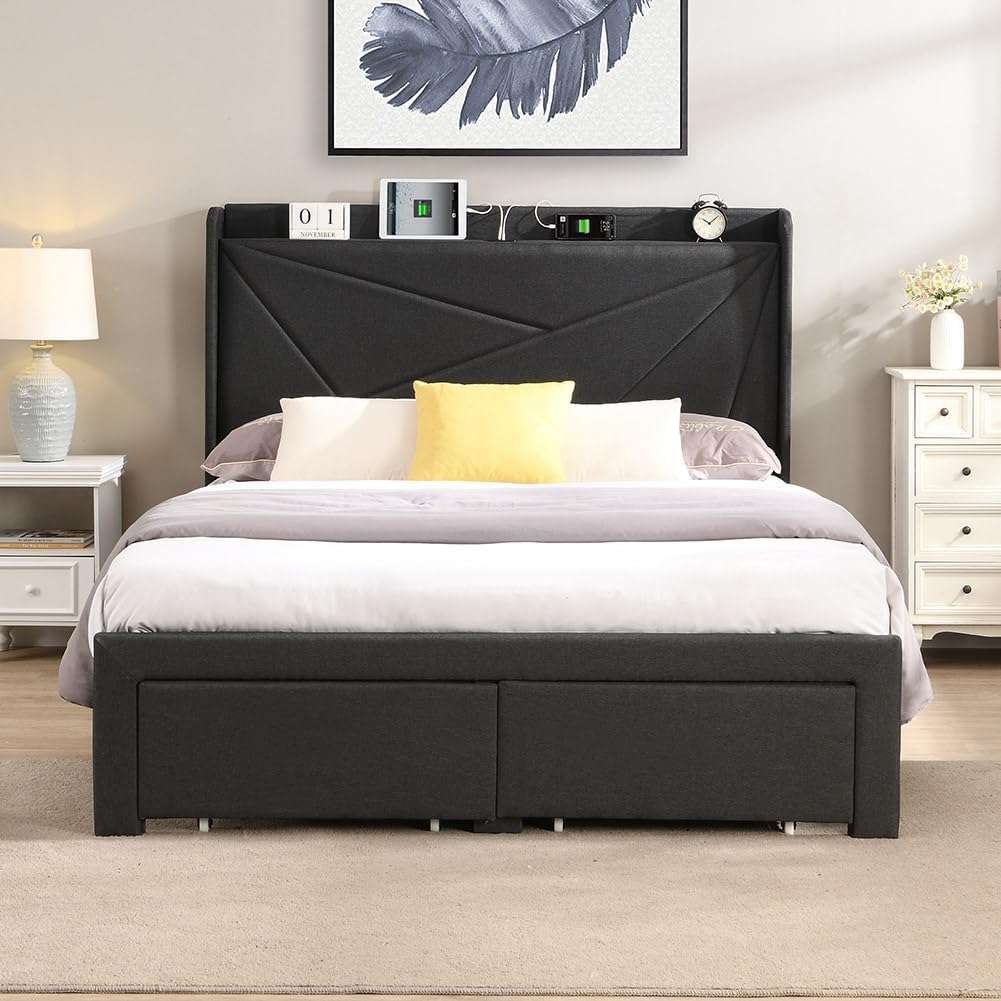 Queen Bed Frame with 2 Storage Drawers, Upholstered Bed Frame with Charging Station