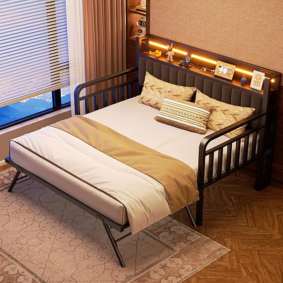 - HEAVY-DUTY METAL CONSTRUCTION: The trundle bed twin frame is crafted from heavy duty metal for exceptional durability and support, holding up to 880 lbs. Its embeded design prevents the mattress from sliding, ensuring stability while you sleep. The curved armrests not only add elegance to the overall design but also enhance comfort and safety. Every element guarantees long-lasting support and a pleasant seating and sleeping experience
