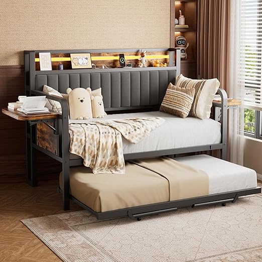Trundle and LED Light, Heavy Duty Metal Twin Bed Frame with Upholstered Storage