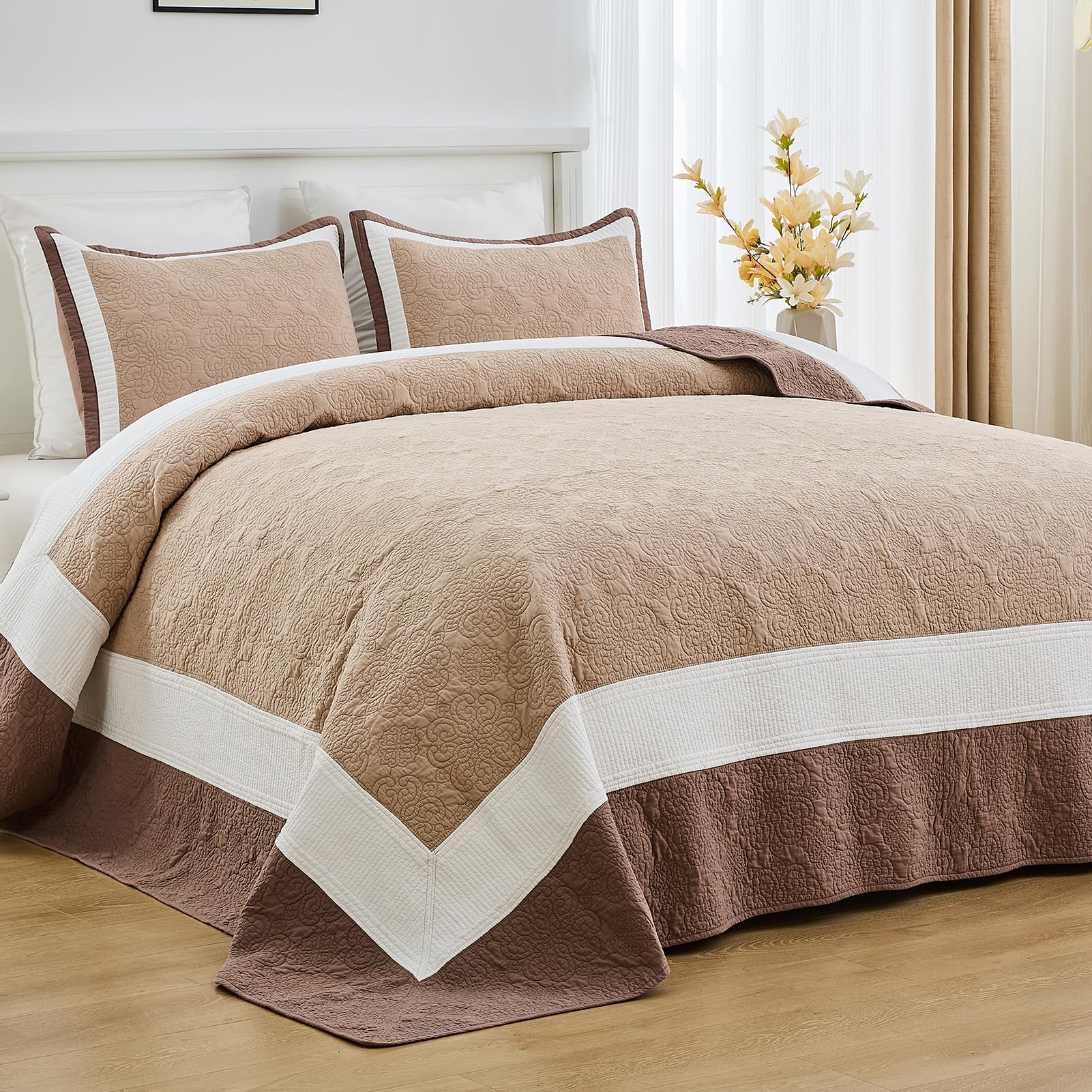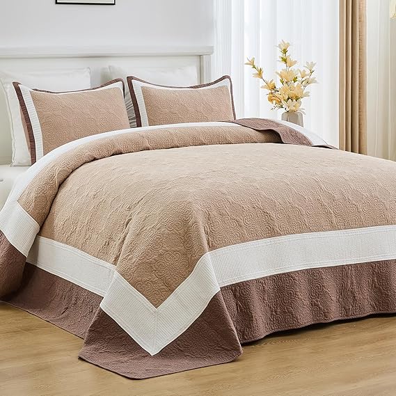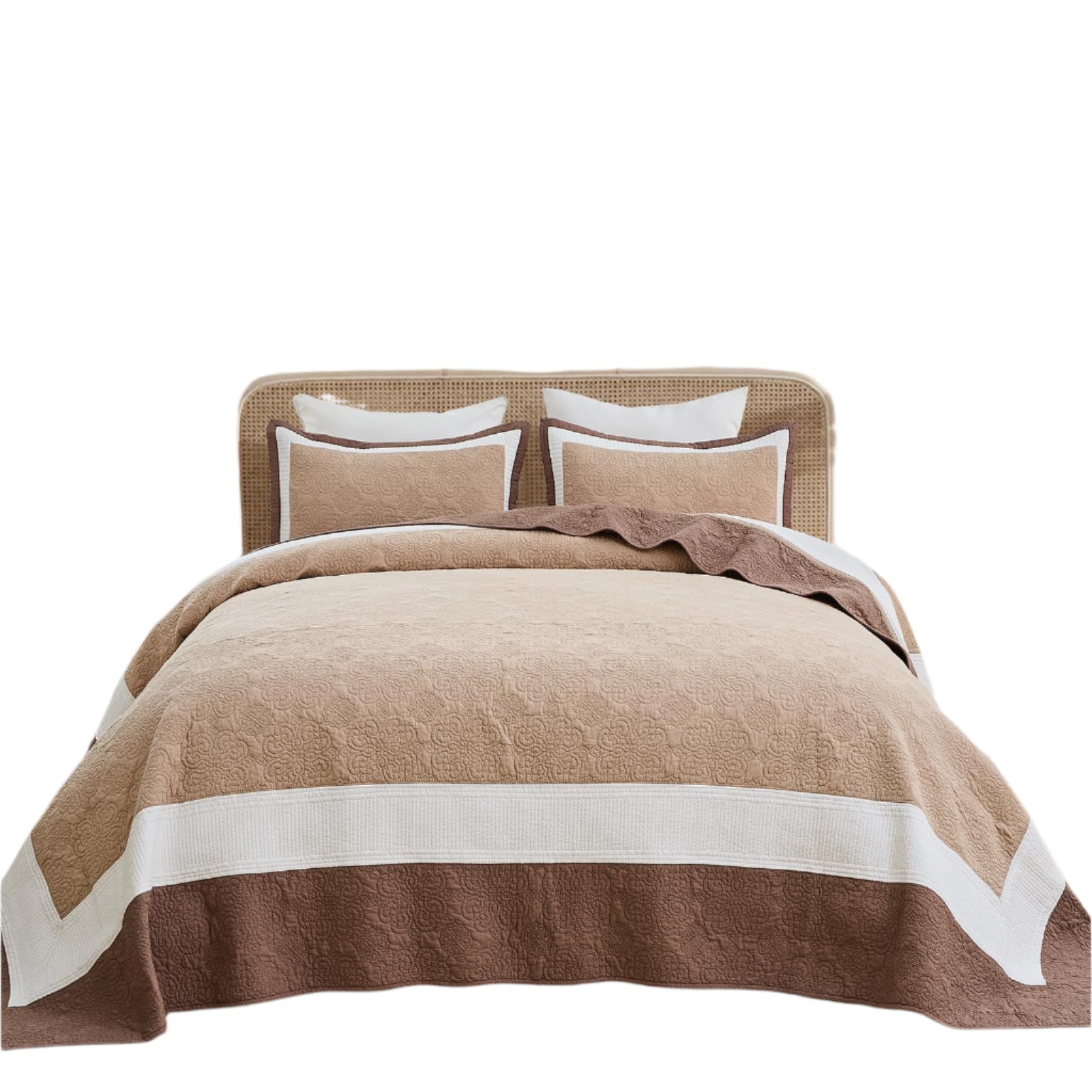- Elegant Design: This bedspread features a minimalist and elegant color-block design, with light brown as the main tone, complemented by dark brown and beige edge stitching, creating a striking contrast. The surface of the bedspread is adorned with exquisite curled floral embossed patterns, adding a sense of detail and texture. The overall design exudes a subtle luxury, making it suitable for a variety of bedroom decor styles and adding a warm, calm atmosphere to the space