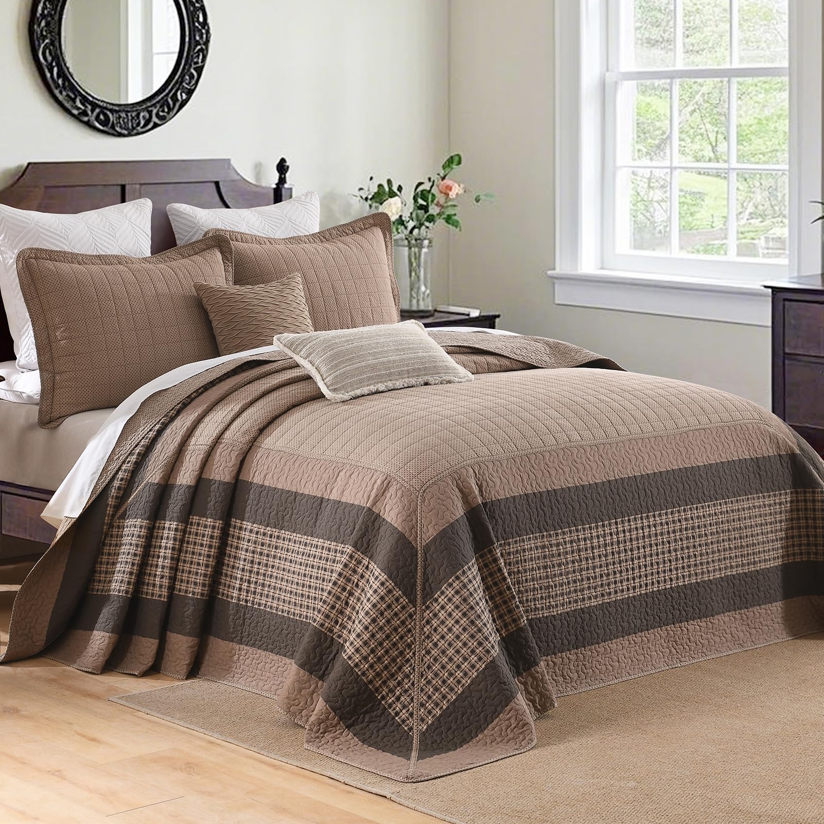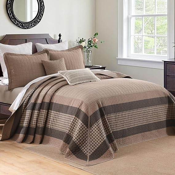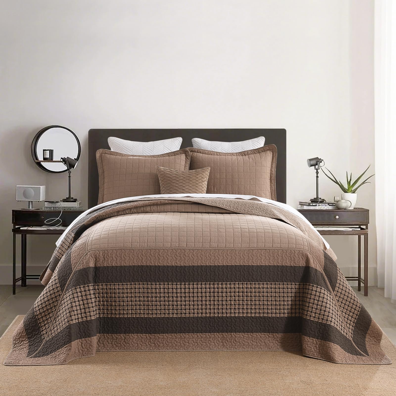 - Elegant Design: This bedspread features an earthy color scheme, combining shades of brown and dark brown. It is adorned with a neat grid quilting pattern, adding texture and depth. The bottom is accented with a checkered stripe element, offering a retro yet stylish touch. This design creates a warm, rustic, and comfortable atmosphere in the bedroom