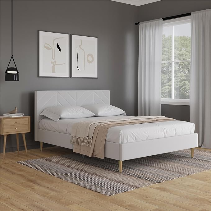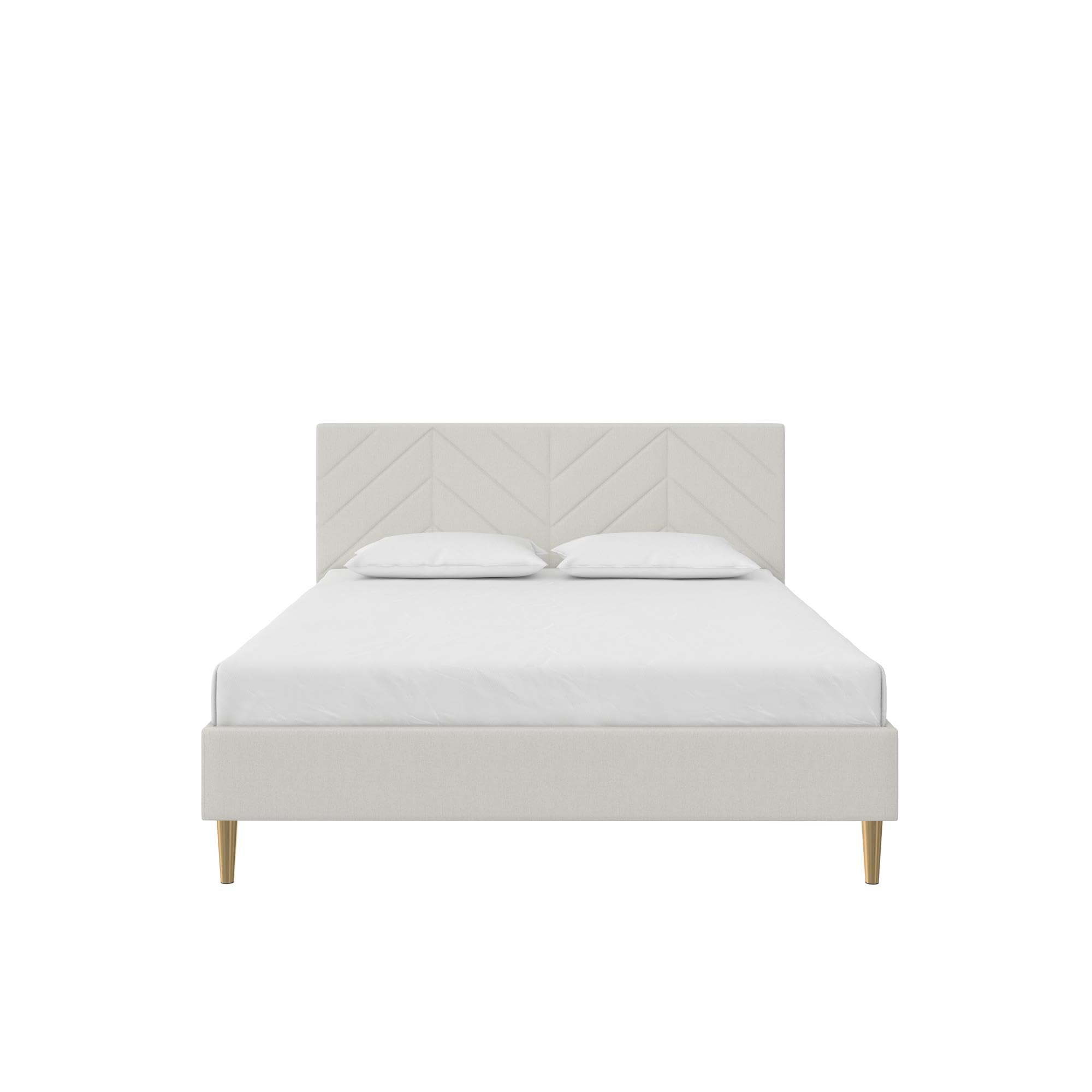 - What bedroom makeover dreams are made of - an edgy 14-inch low profile platform bed that flouts style expectations with a slim chevron pattern tufted foam padded headboard and satiny gold metal tapered legs fit for any master or guest room
