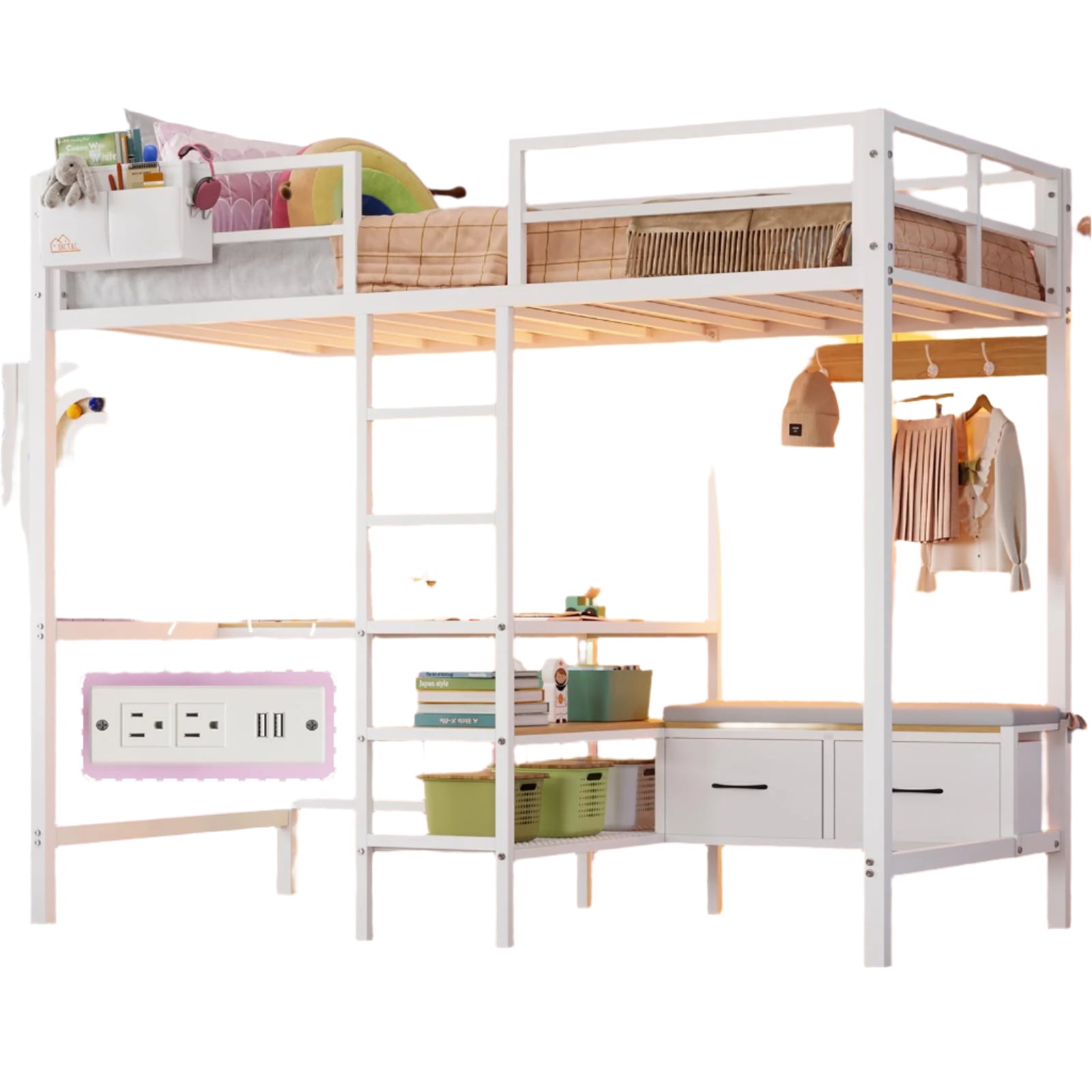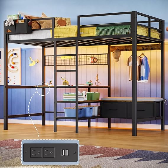 - There is a L-shaped desk with outlets to the left under the twin loft bed.While satisfying rest, creates a productive, simple work, study or gaming area for your child, ideal for adults and teens. The built-in charging station includes 2 outlets and 2 USB ports, which are convenient for charging your mobile phone, tablet, computer or gaming device.The 2 open storage shelves under the study desk can place your books, files, home printer, or decorations.