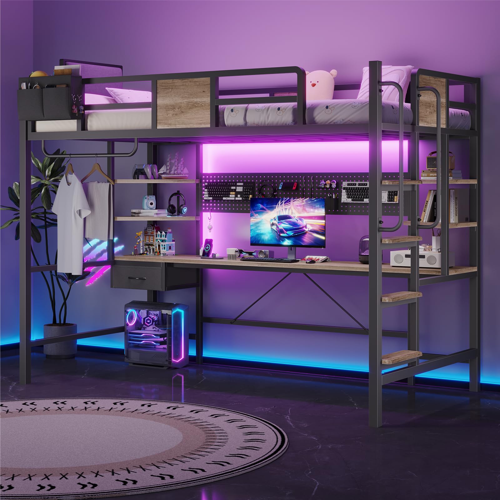 Loft Bed with Desk Twin Size Twin Loft Bed with LED Lights