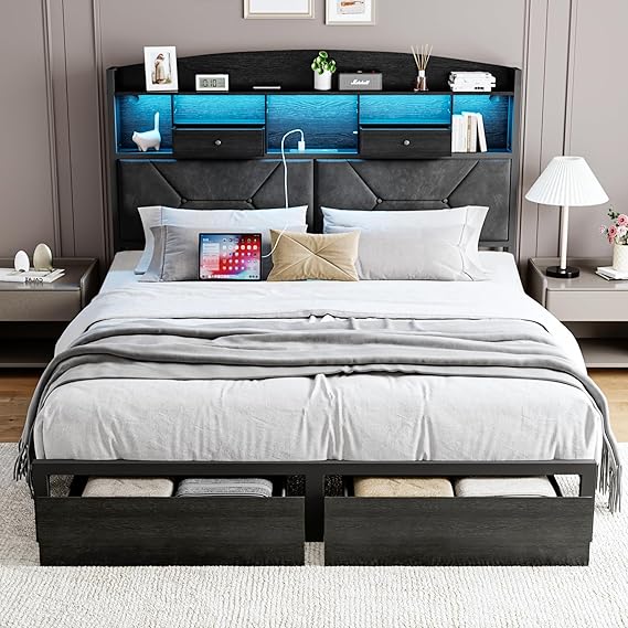 - THREE GORGEOUS LED RGB LIGHT STRIPS : This led bed frame full with 3 led light strip supports headboard and two side of bed shinning, Multi-dynamic modes, music lights interact, timing and mic function. Whether it's a flashing coloured light effect or a soft, subtle glow, you can adjust it to your heart's content, choose changeable led lights will illuminate your bedroom, ward off the darkness and provide a warm and colorful atmosphere for comfort sleep.