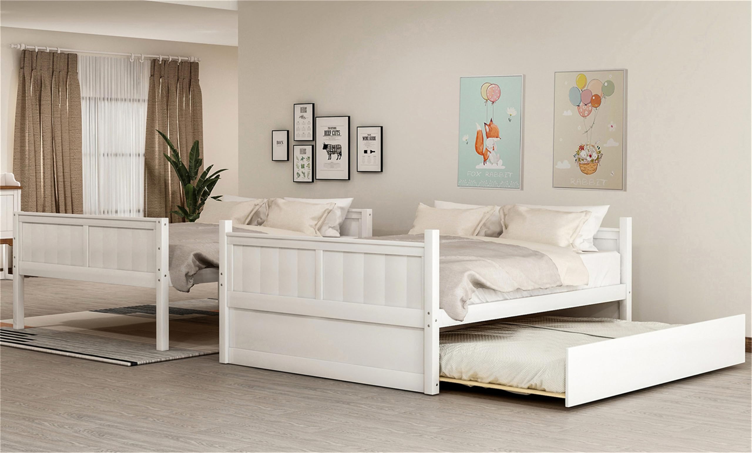 - Convertible beds: Full bunk beds can easily convert into two separate beds, making it easy to adapt or adjust according to the needs of your family. Trundle is easy to pull out and can be used as a spare bed for sleep overs or guests. And easily prepare extra bedding no matter what your needs.