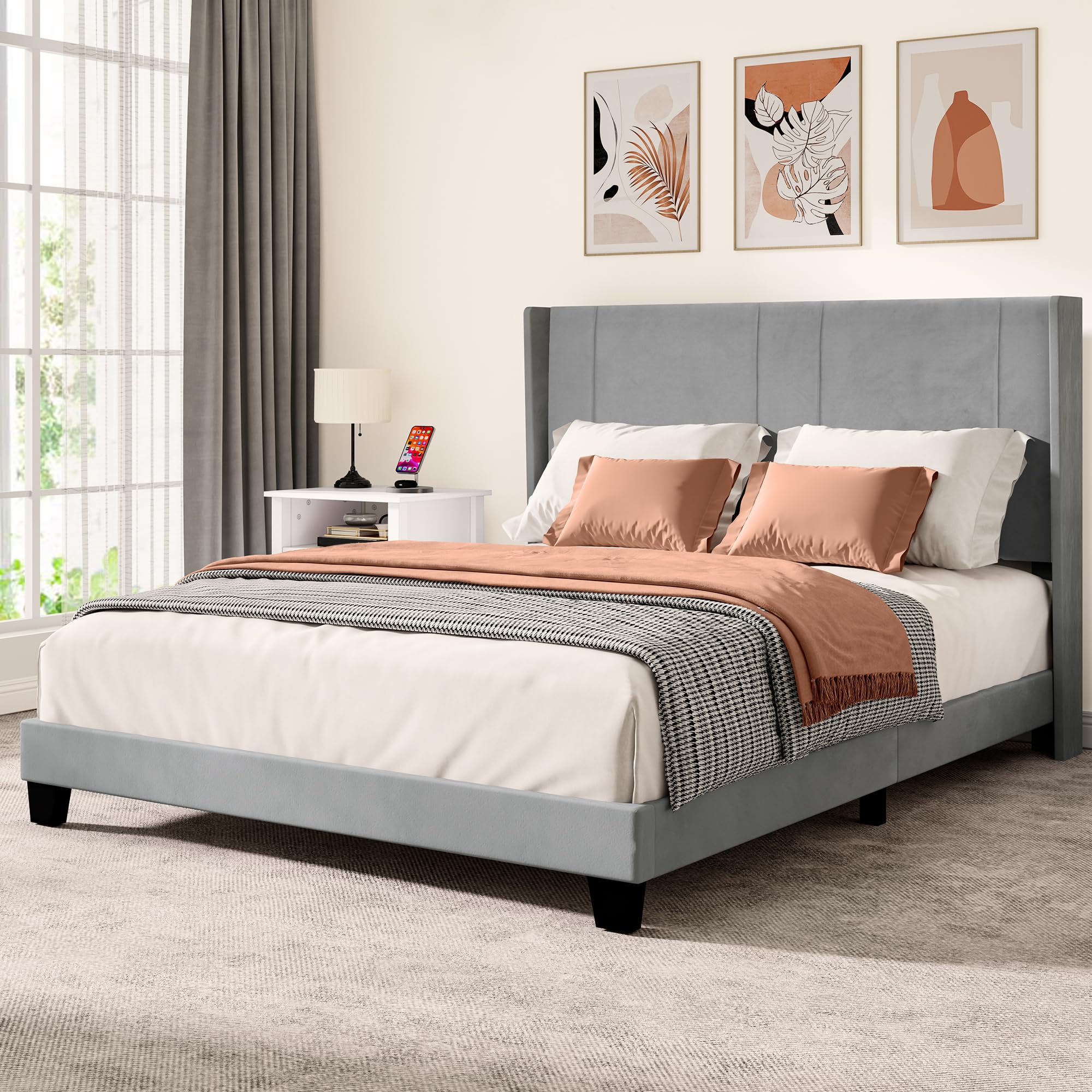 Queen Size Bed Frame, Upholstered Bed Frame with Grey Velvet Headboard