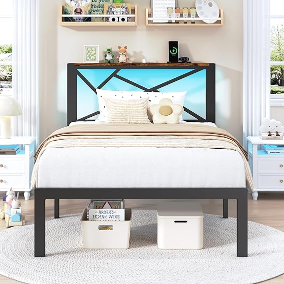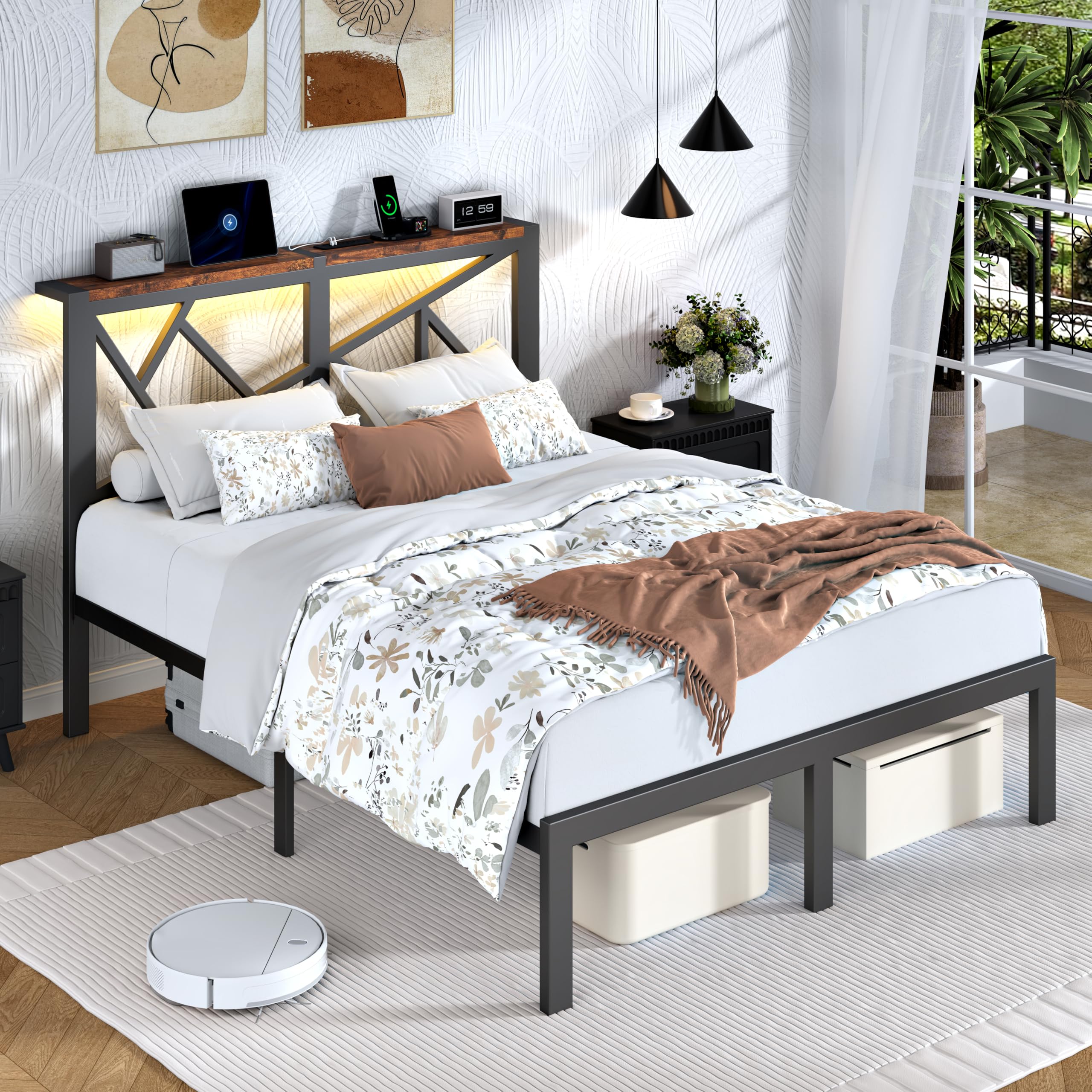 Queen Size Metal Bed Frame with LED Lights, Storage Headboard