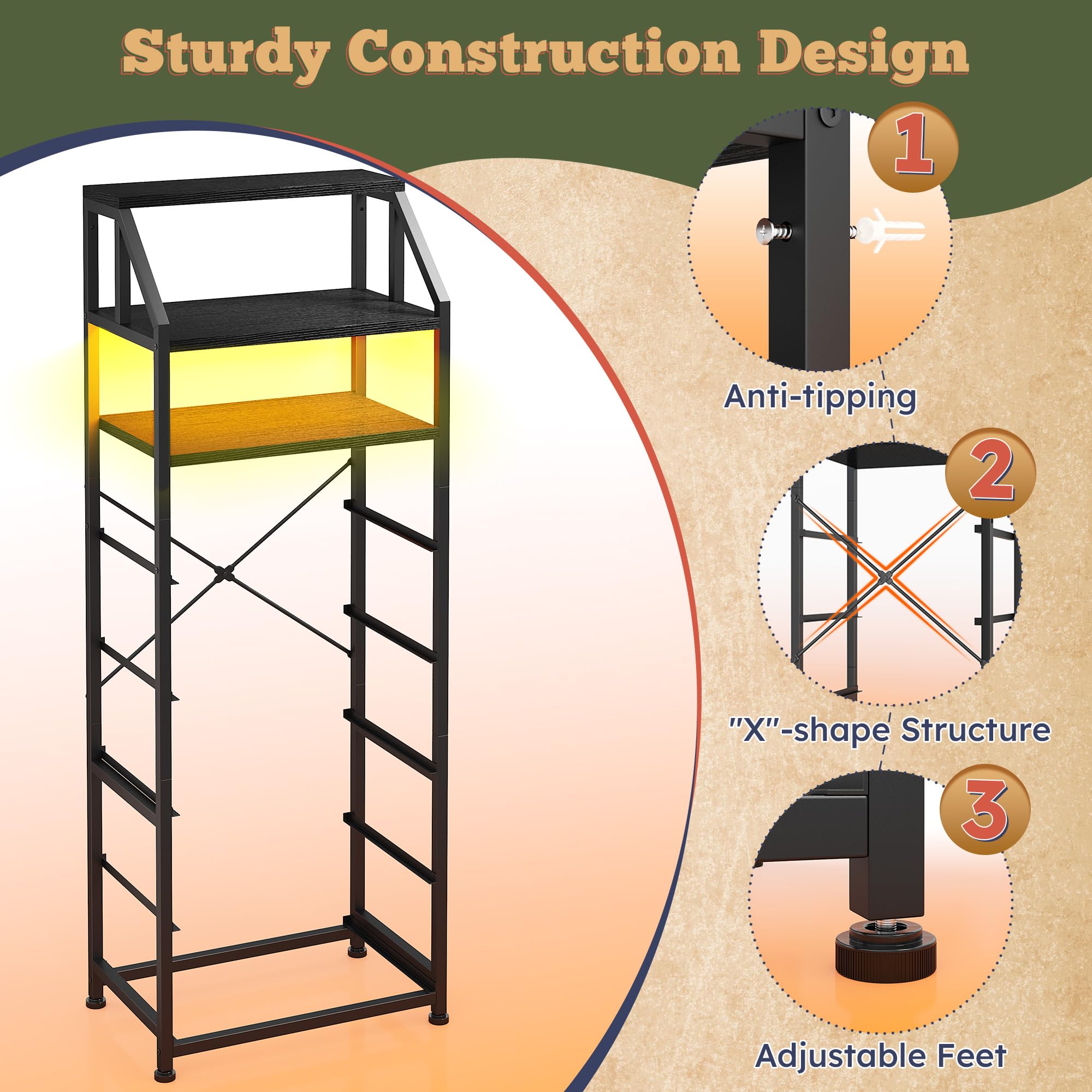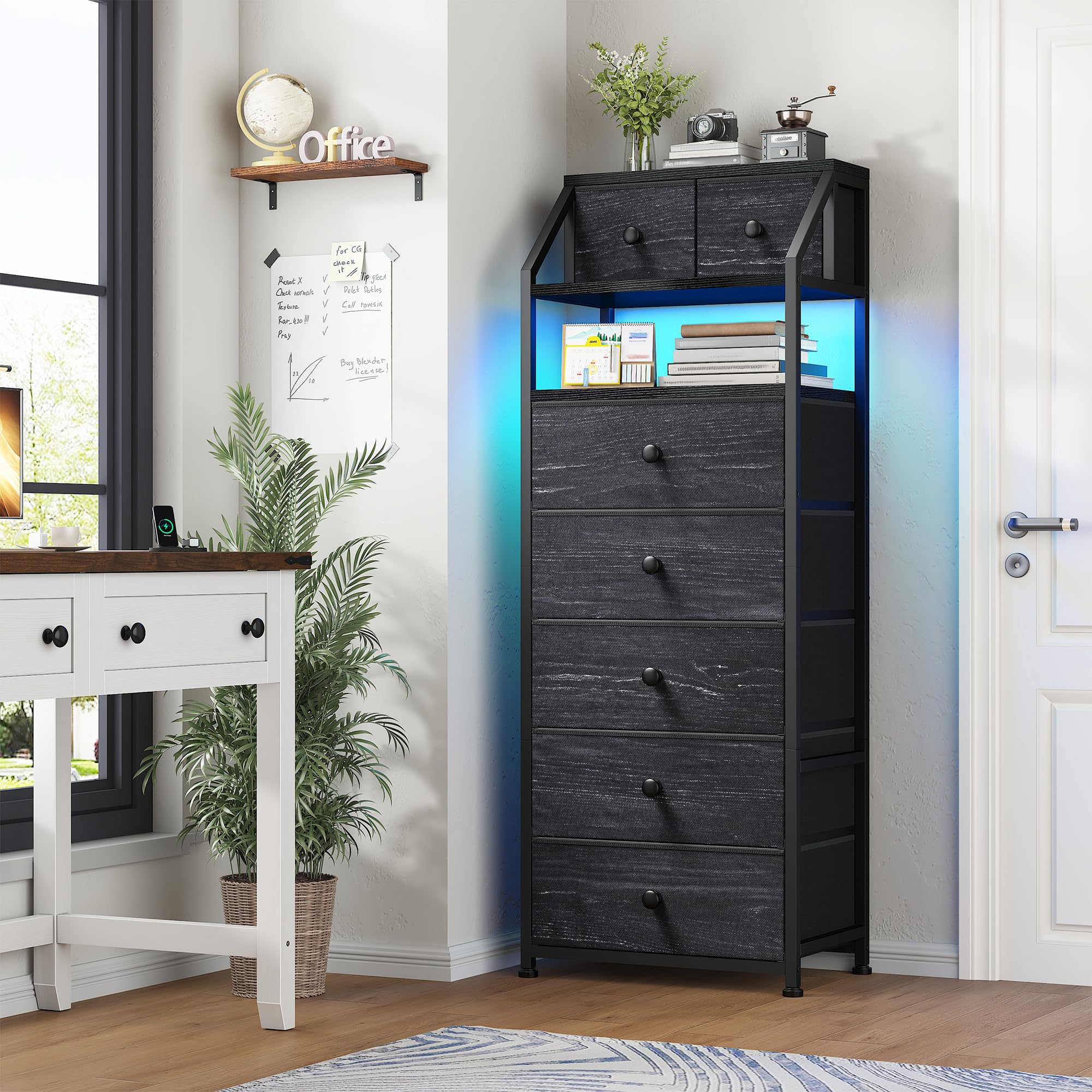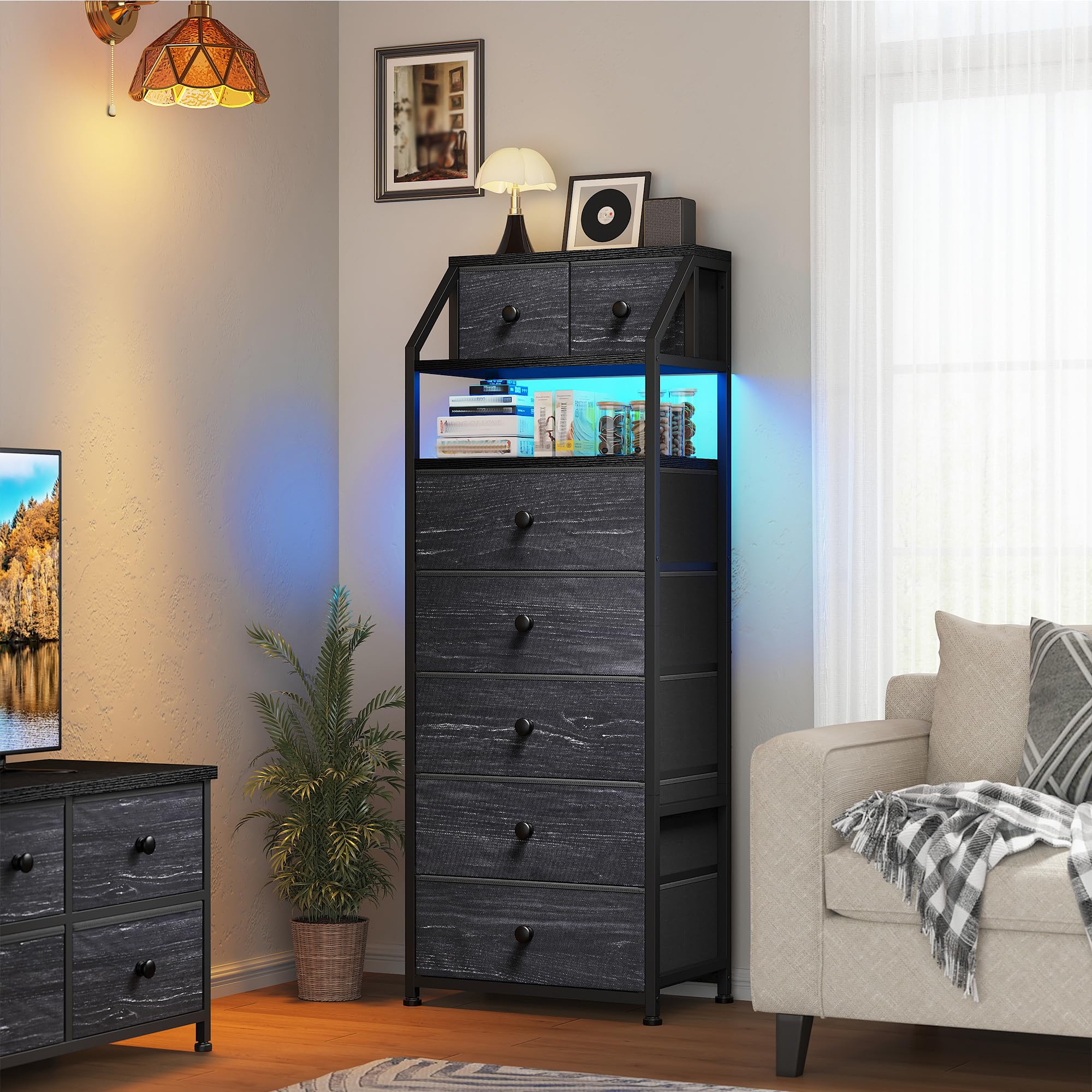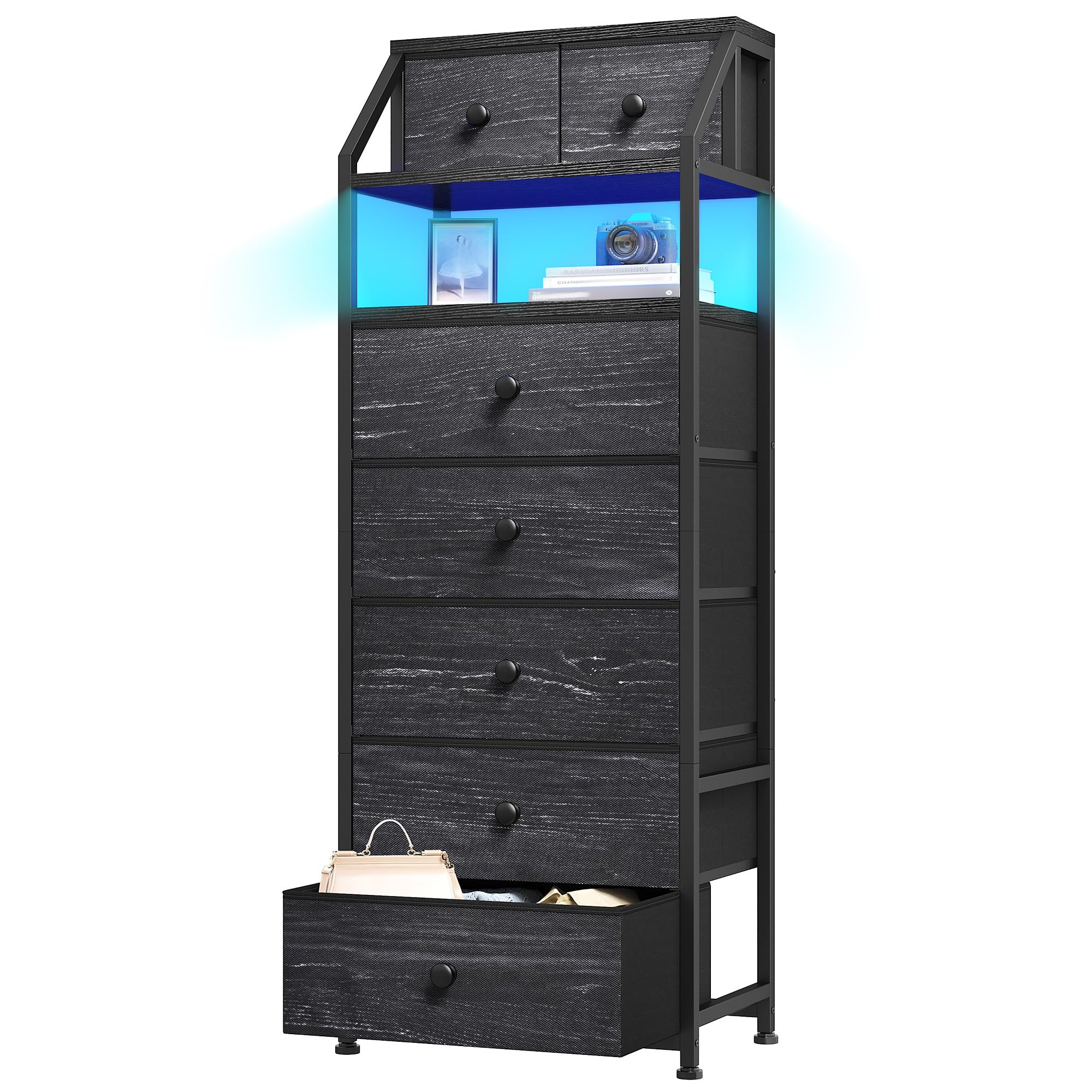 EnHomee 51.2" H Tall Dresser for Bedroom with LED Lights, Night Stand with 7 Drawers, Dressers & Chests of Drawers with Open Wood Shelf, Metal Frame, Bedside Table with Fabric Storage Bins, Black