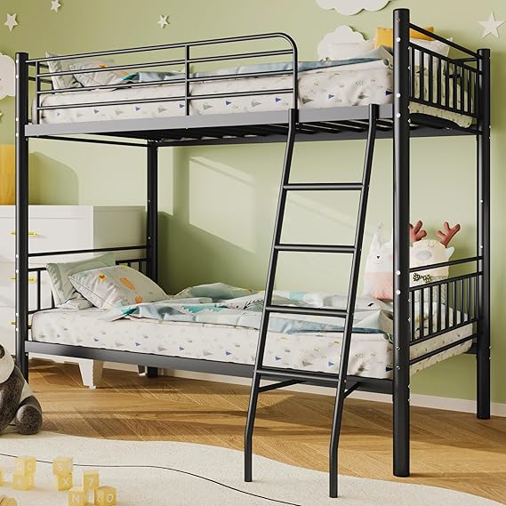 - Designed with child safety in mind, the Metal Bunk Bed features an external ladder with an inclined design, making it easy for kids to climb. The smooth round tubes protect their feet from injury while navigating to the top bunk.