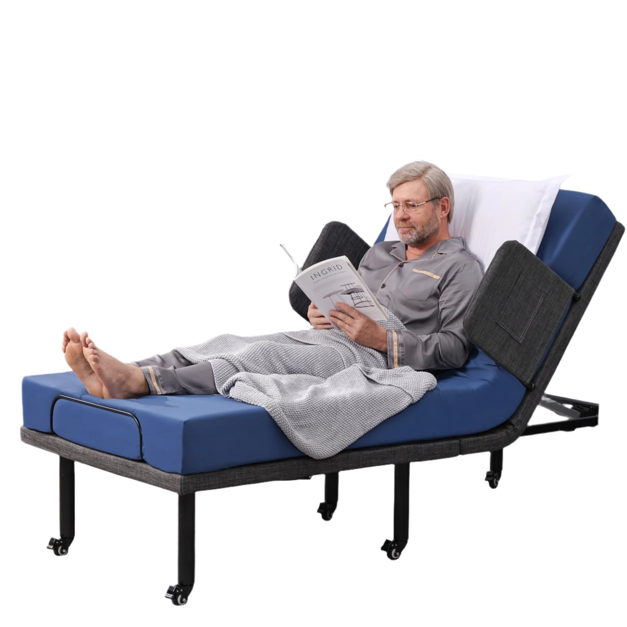 - The adjustable bed frame is equipped with grab rails, underbed night light, and adjustable legs with wheels. The bed can help people have good nursing and a convenient life.