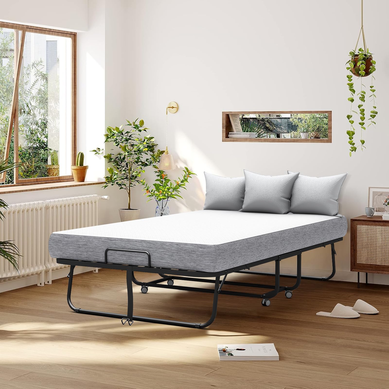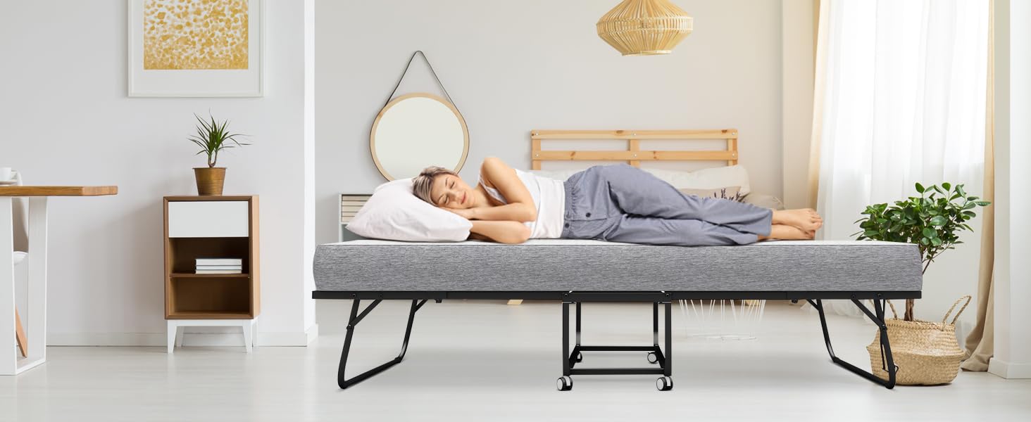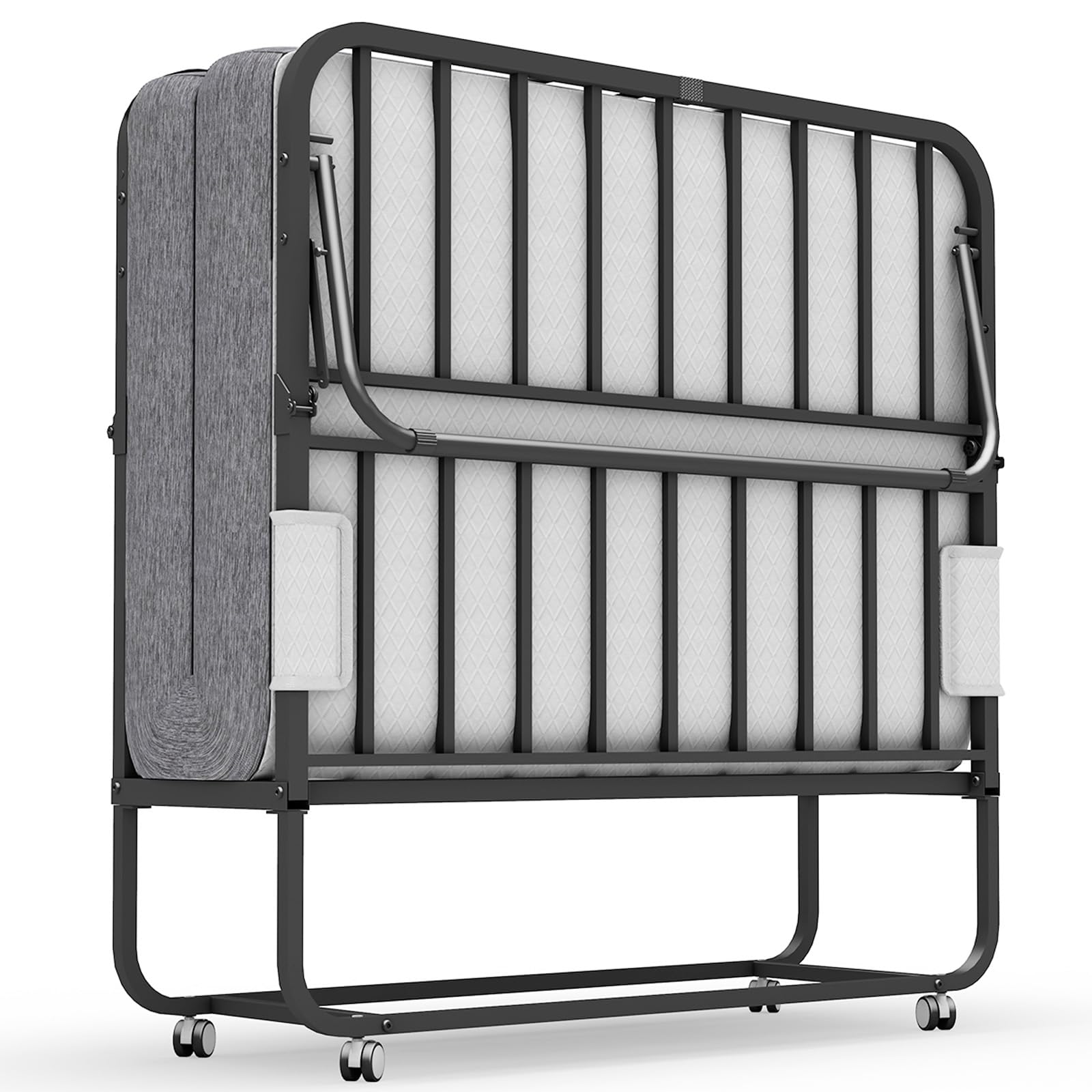 - This rollaway bed has a folding thickness of only 14 inches, making it perfect for small spaces; After folding, you can store the folding bed in a closet or against a wall. With the help of smooth rolling universal wheels, one person can easily push it; This folding bed is perfect as an extra guest bed when your family or friends visit.