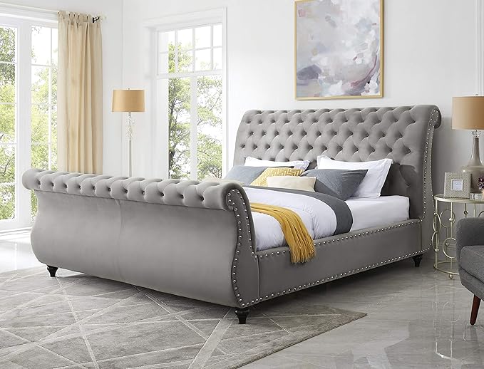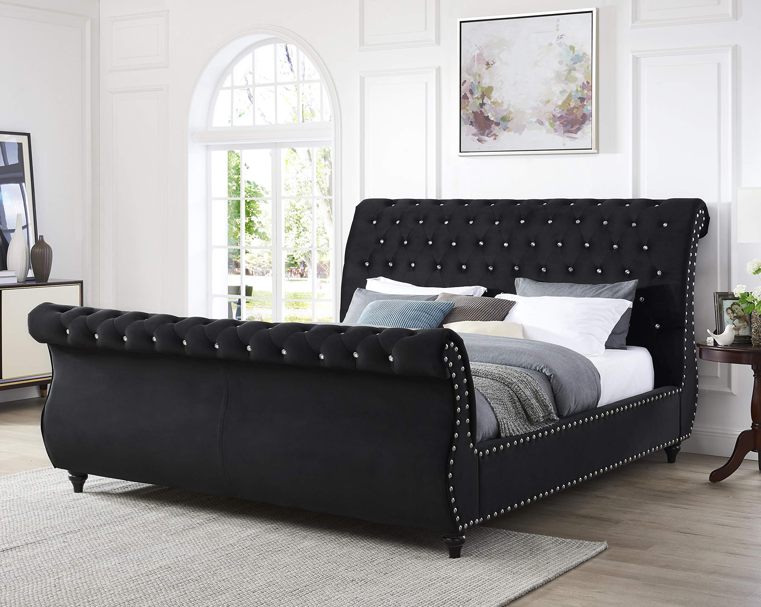 - Sleigh design with a scrolled headboard and footboard, soft velvet upholstery in black color