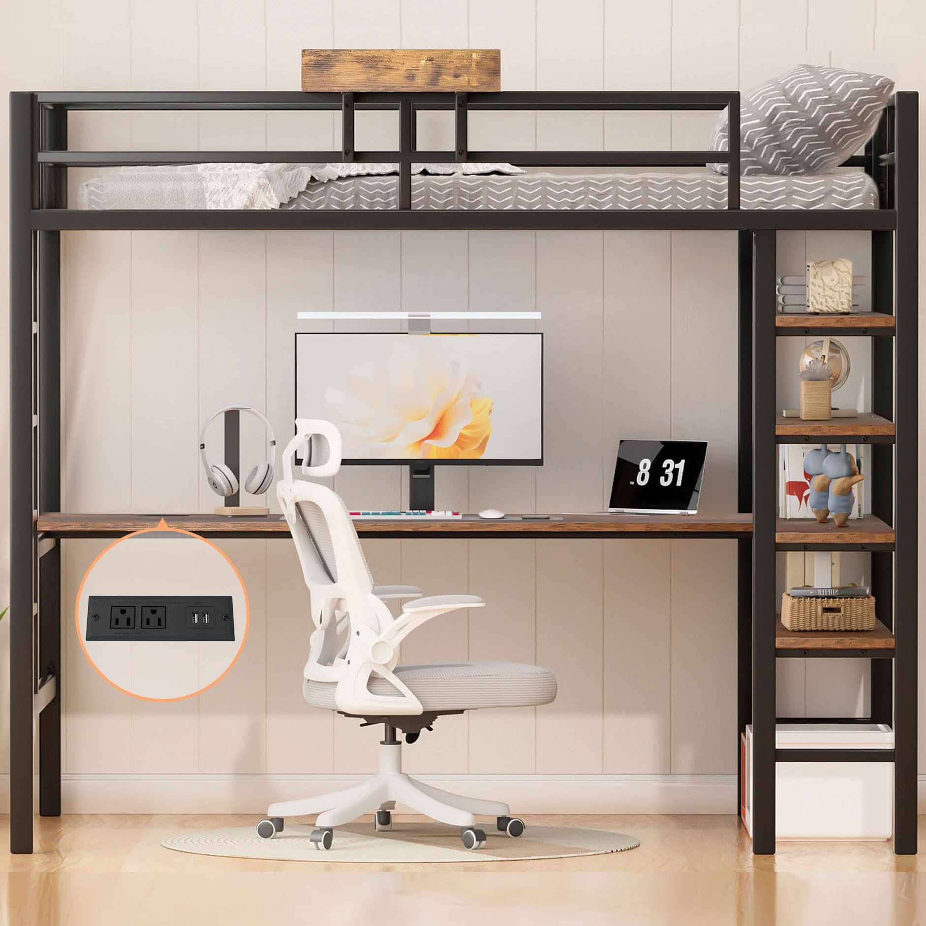 Loft Bed Twin Size with L Desk/ 4-Tier Storage Shelves, Heavy Duty Metal Bunk