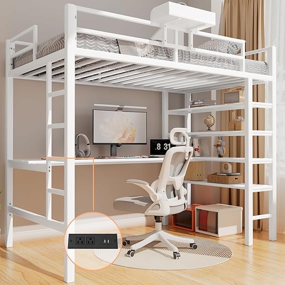 - LOFT BED WITH "L" DESK & OUTLETS: The loft bed frame can be divided as two separate spaces. While satisfying rest, the 59"H of spacious space underneath the top bunk bed provides more personal space. L-Shaped Desk creates a productive & simple area for working, reading, study or leisure. Built-in charging station make it convenient to charge your laptop, tablet, smartwatch or mobile phone. Perfect for Space-Saving Needs.