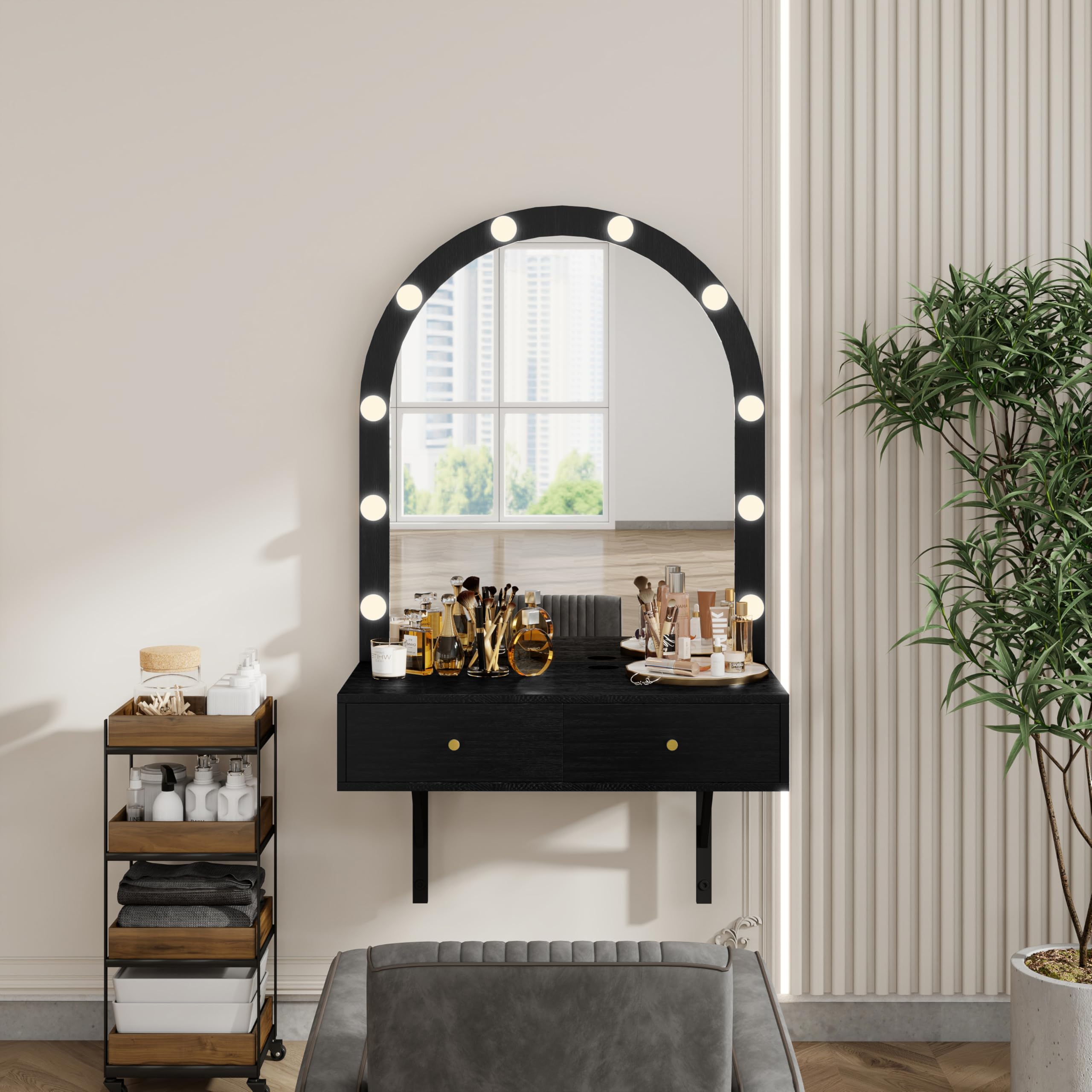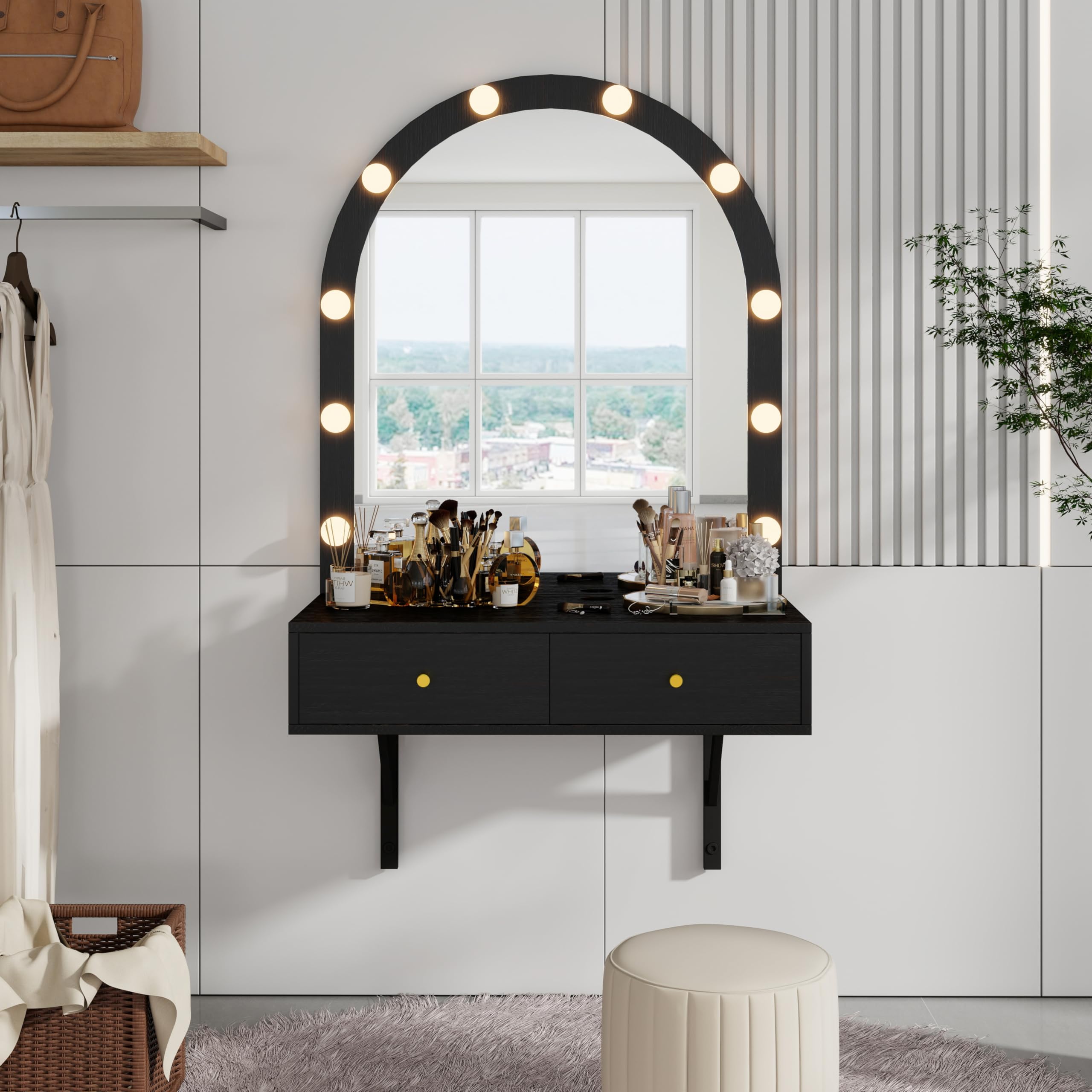 - [Wall-Mounted Design & Versatile Use] The wall-mounted vanity desk can meet your makeup needs without taking up space, convenient and practical. And the space-saving vanity allows you to adjust the installation height according to your height and usage habits, perfectly adapting to any space, including bedrooms, bathrooms, and salons. In addition to serving as a dressing table, it can also be used as a wall-mounted storage rack or desk, with its multifunctional design meeting all your needs